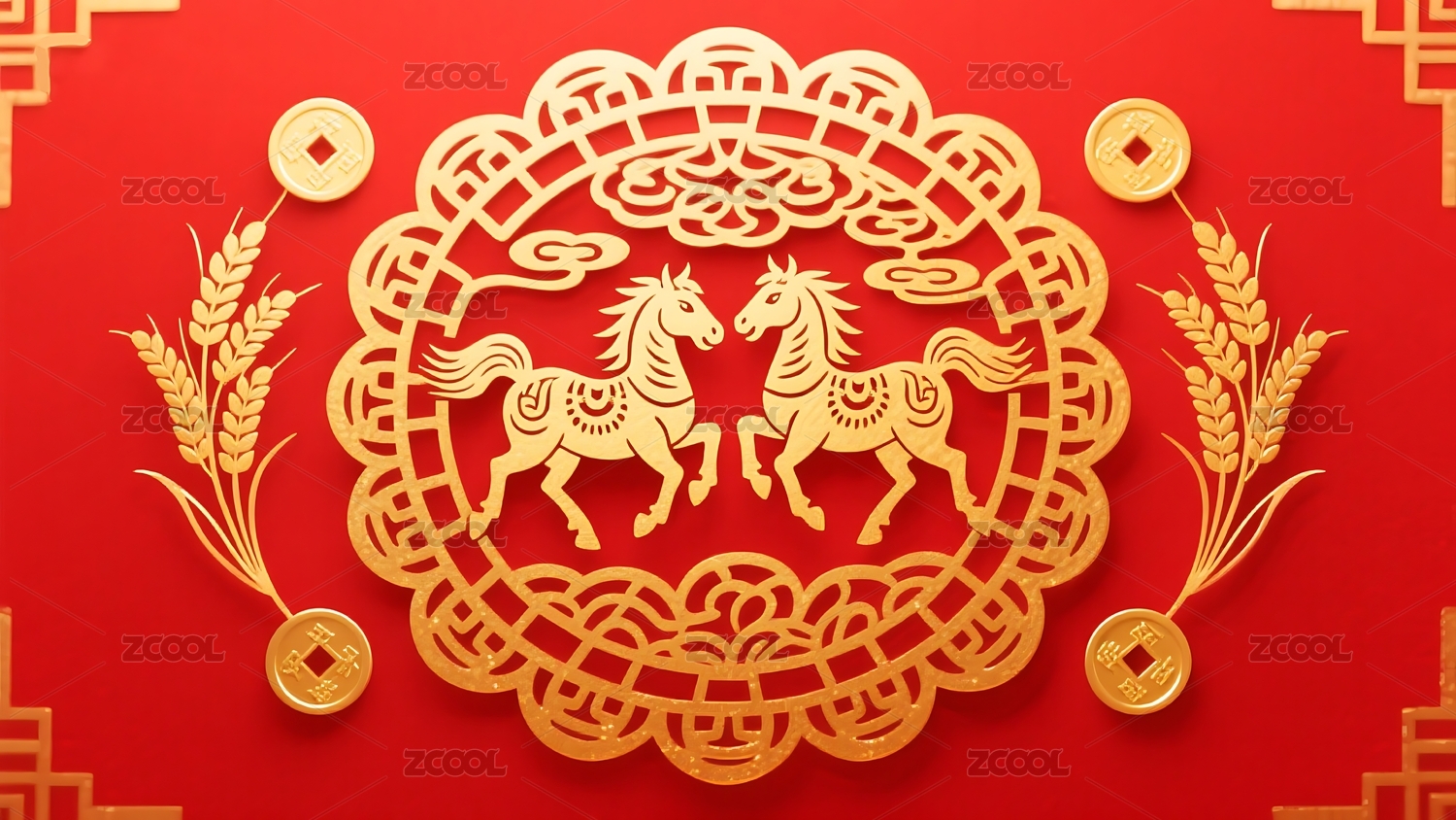 圆形,立体,艺术,装饰,对称,双马,剪纸,铜钱,传统,纹样