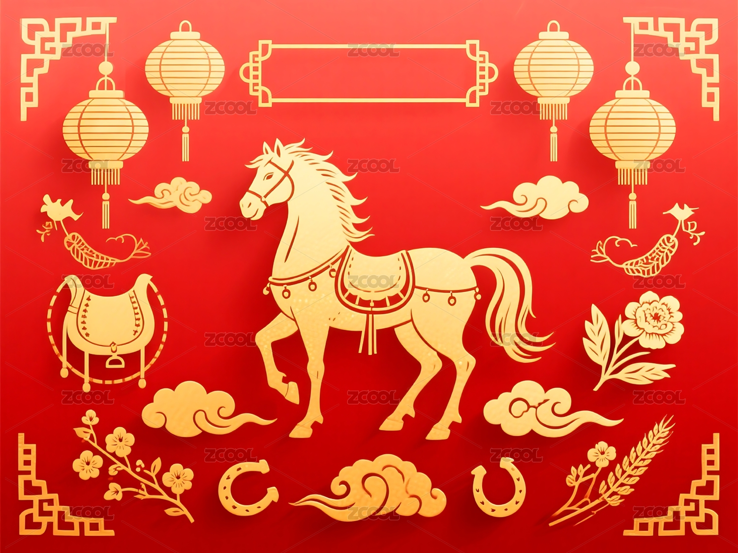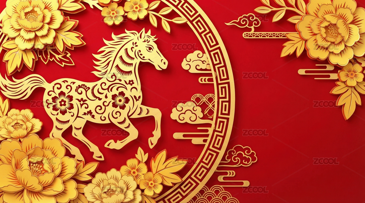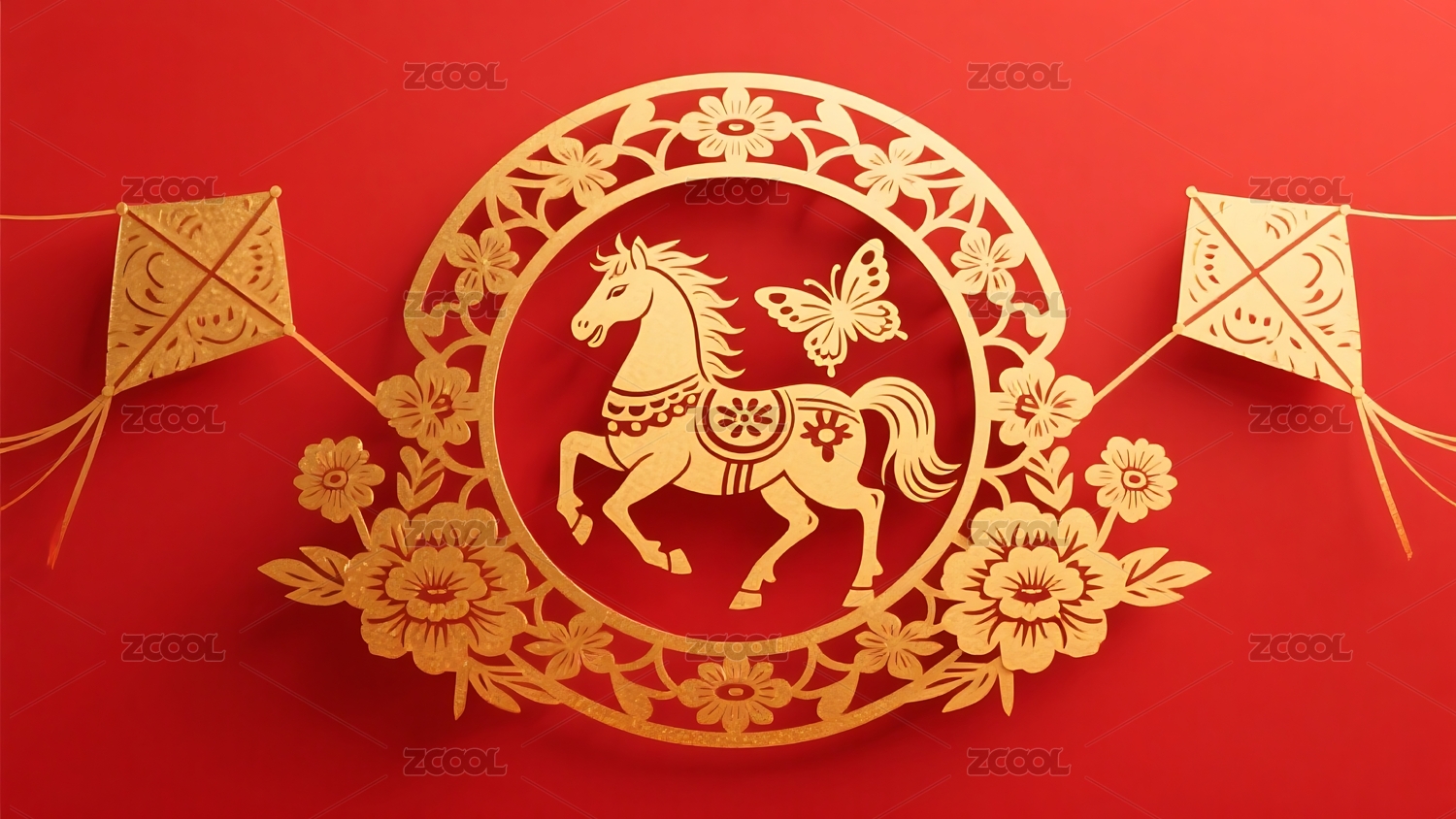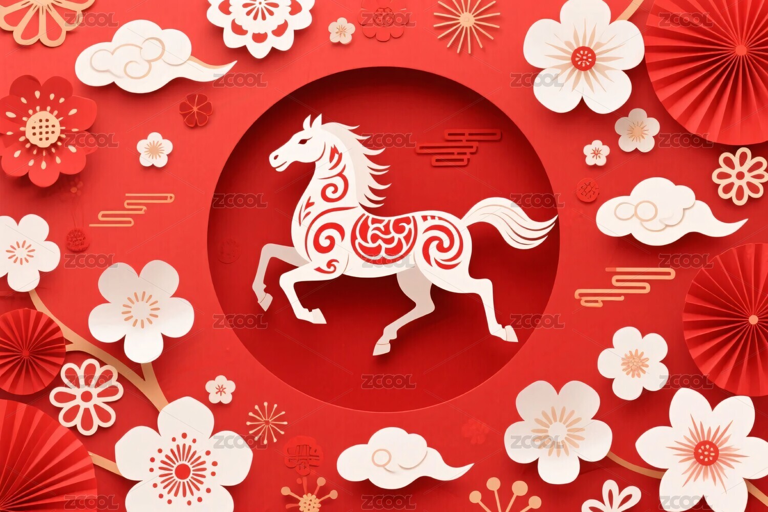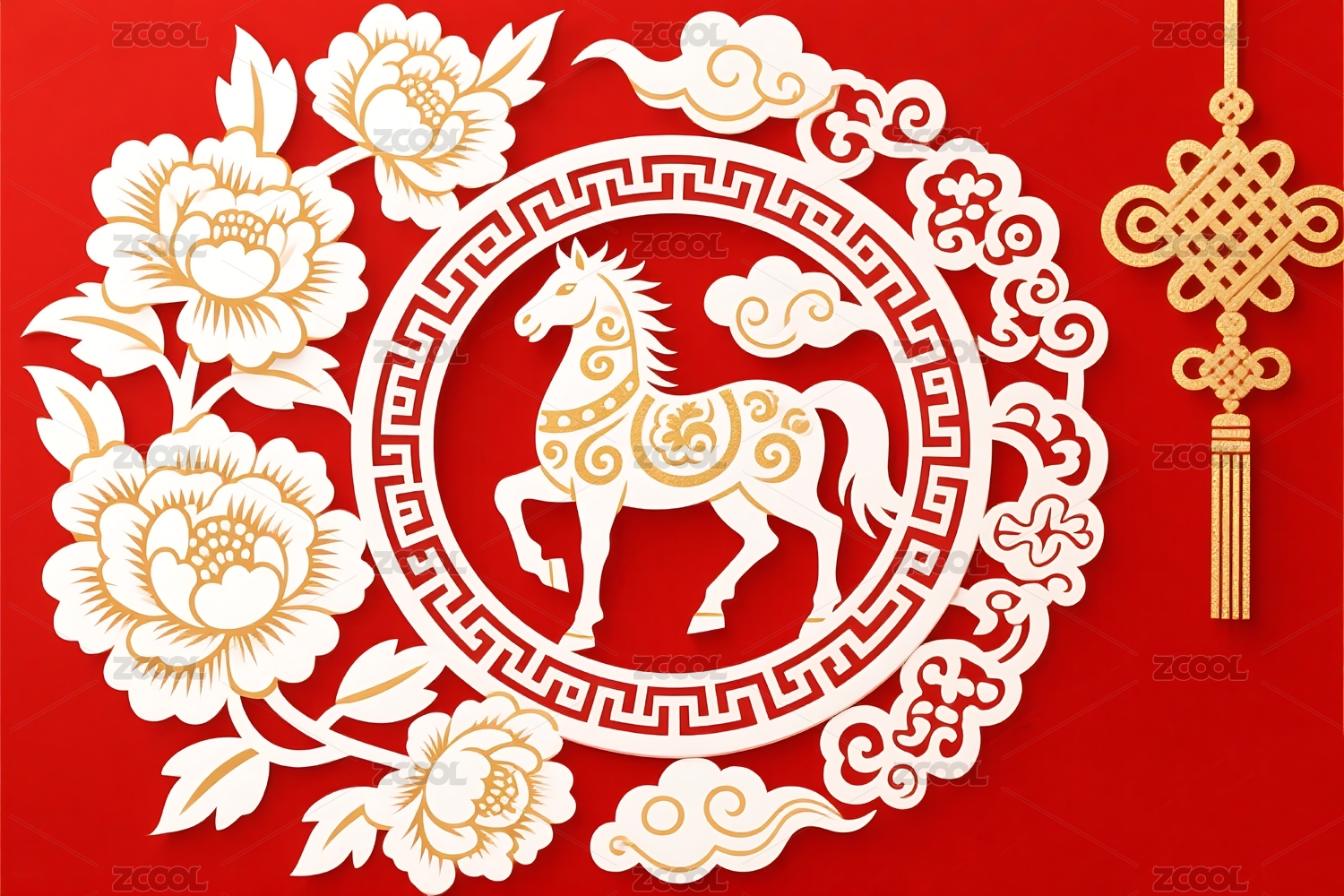 剪纸,马,红色,背景,图案,云纹,花朵,圆形,装饰,传统