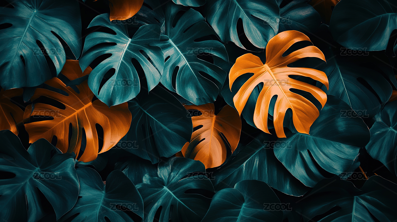 深背景上的多彩龟背竹叶图案