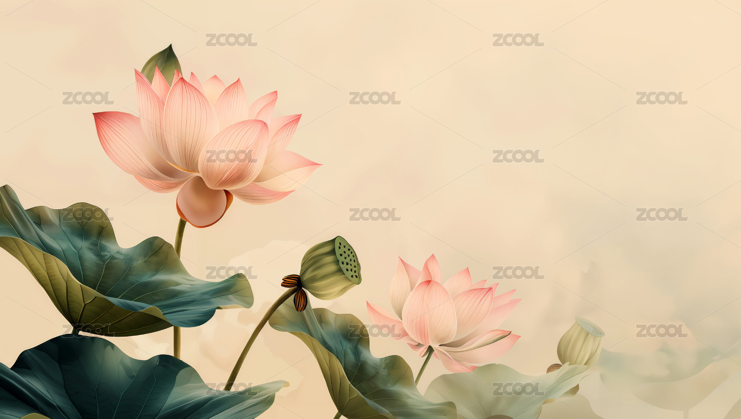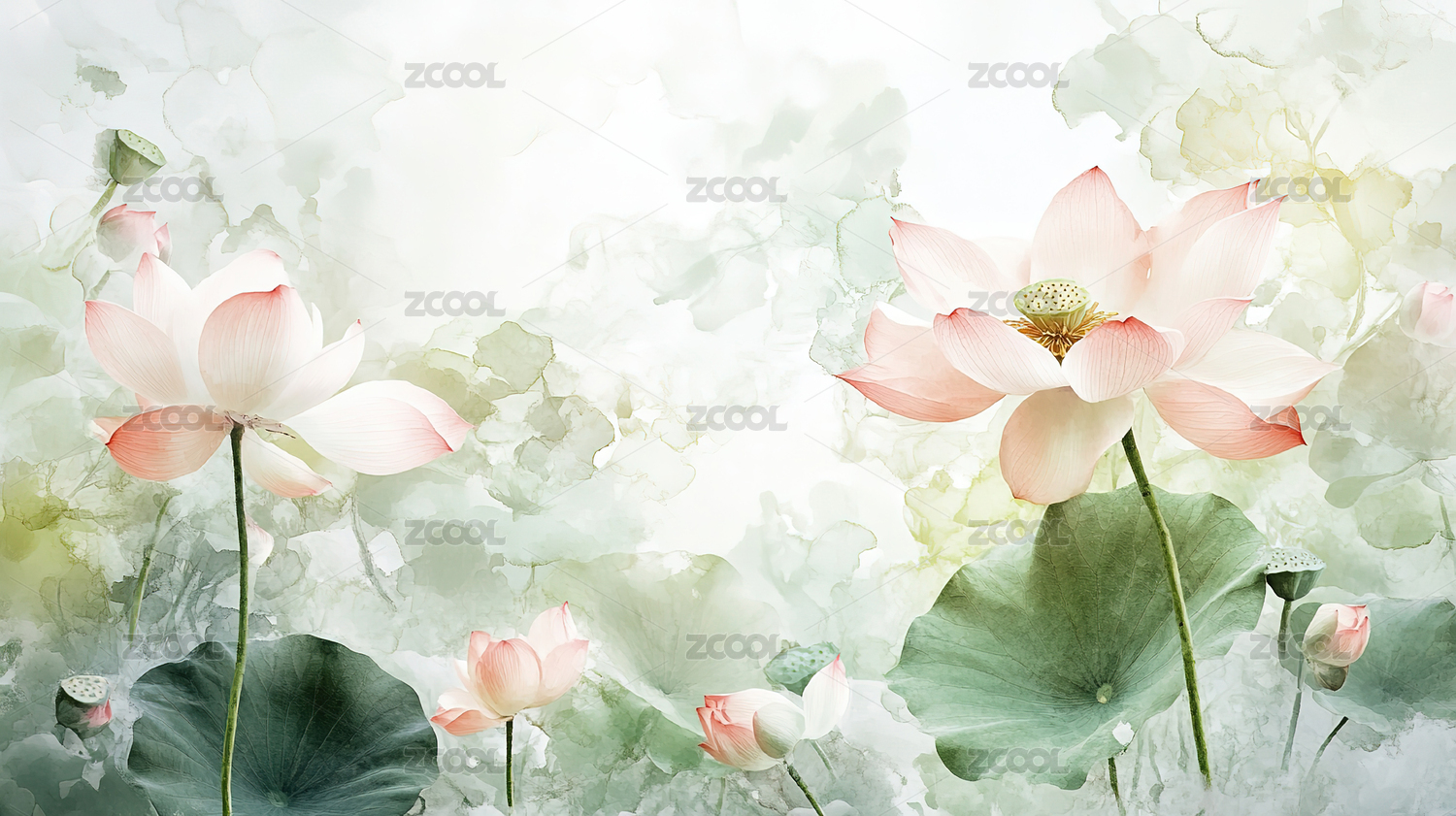 中国风荷花荷叶淡彩水墨插画壁纸背景