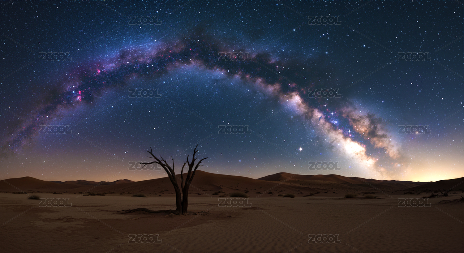 荒漠中一棵枯树的上空横贯着一片绚丽的星云