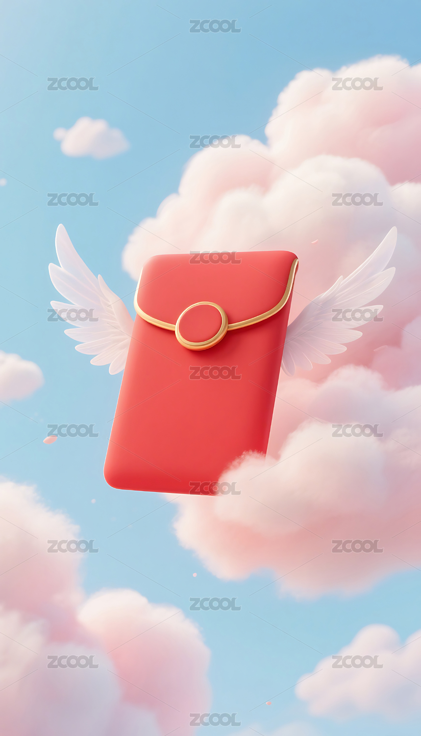 3D长翅膀的红包云朵背景图