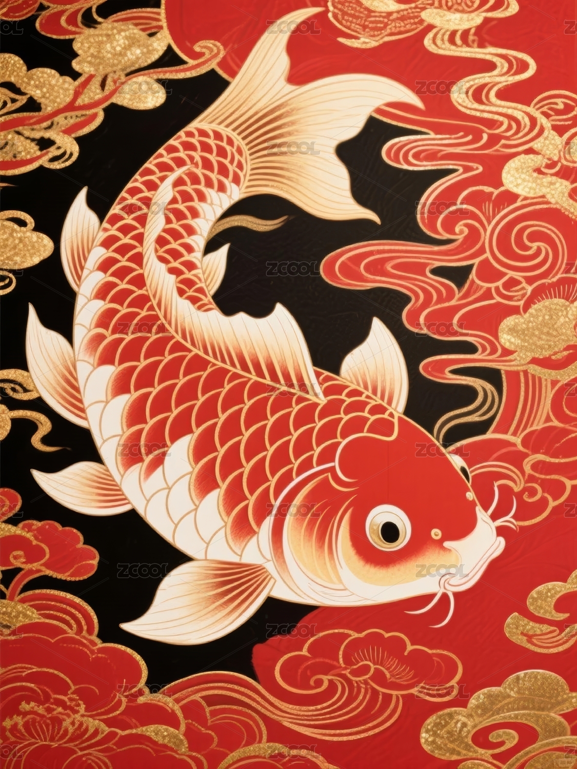 主视觉,红色,锦鲤,传统风,装饰,插画,场景,金色,云纹,图案