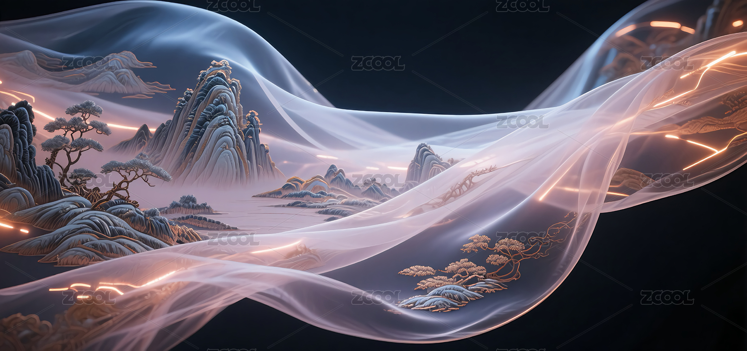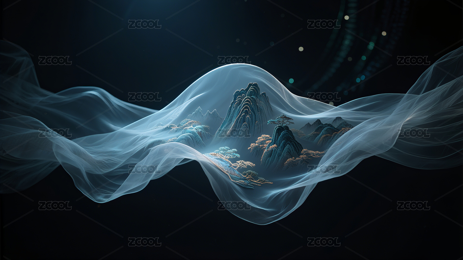 主视觉,山水,蓝丝,国风,场景,山脉,水流,线条,艺术,插画