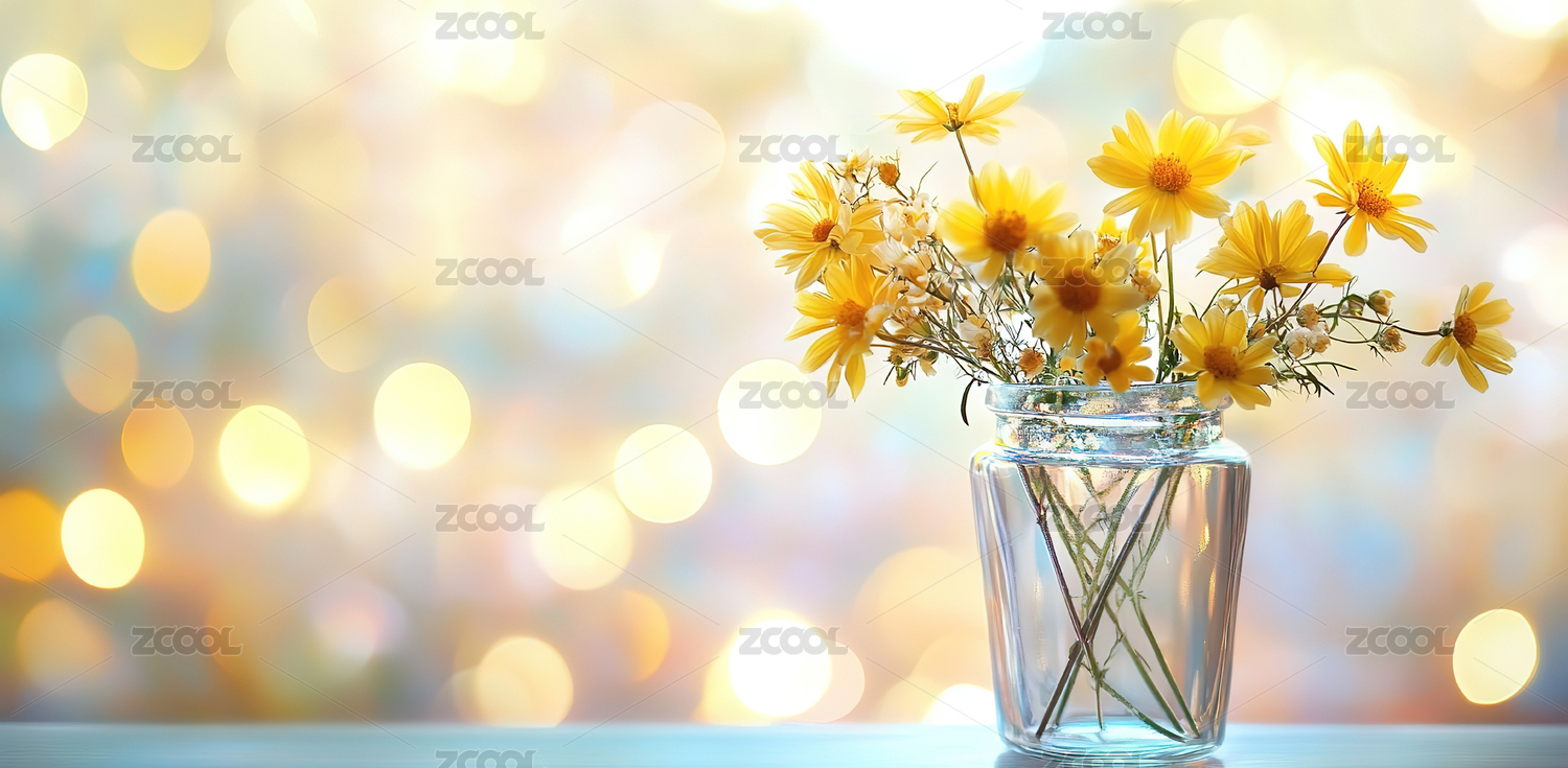 秋季深秋阳台上摆放着玻璃瓶里的金色花朵