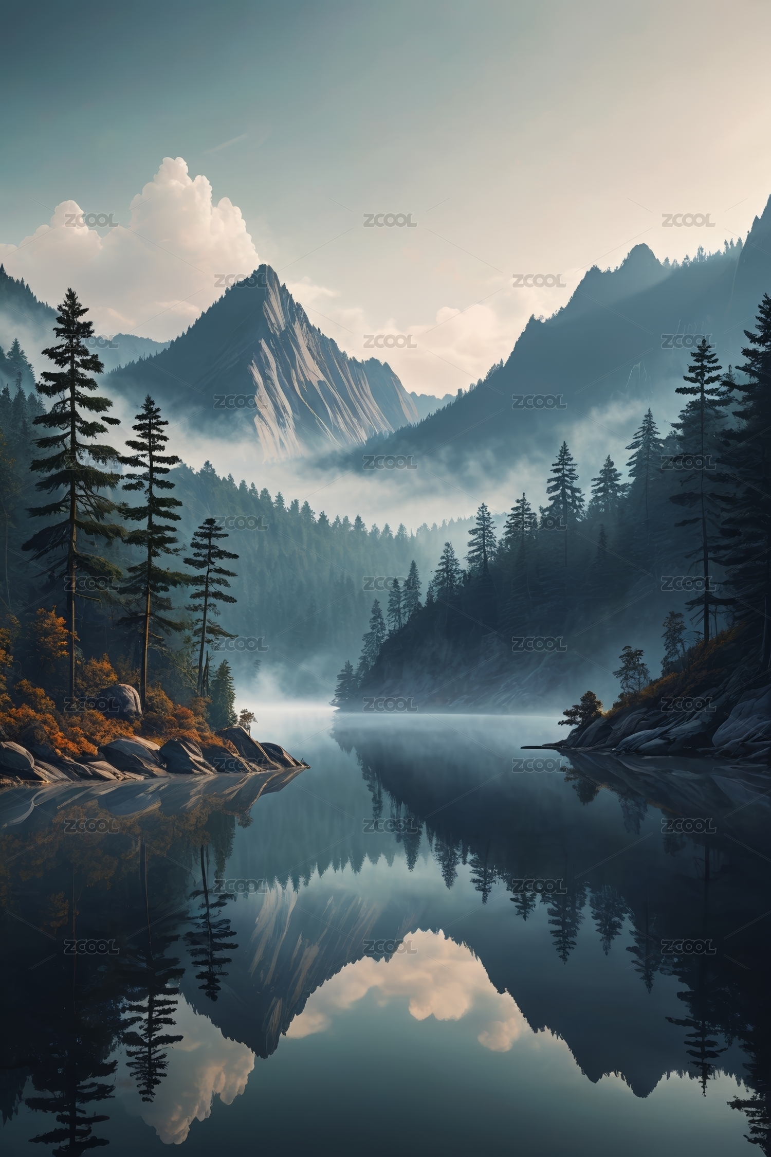 雾锁山间湖光静谧 山水倒影如梦似幻