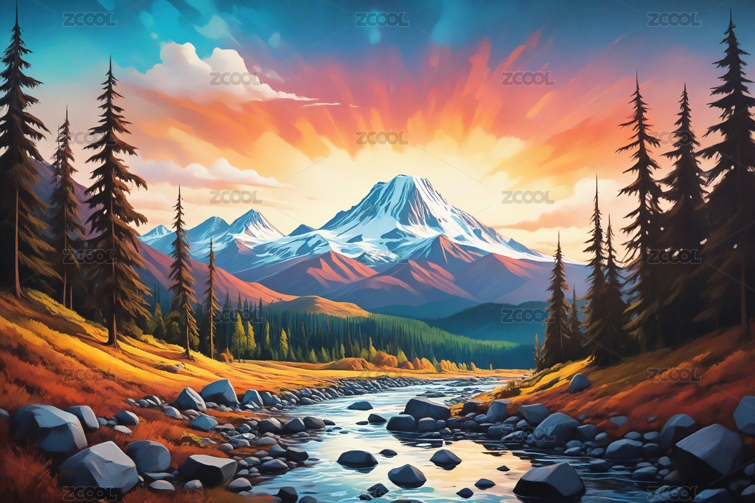 主视觉,山水,风景,插画,场景,两幅,湖泊,森林,山脉,日落