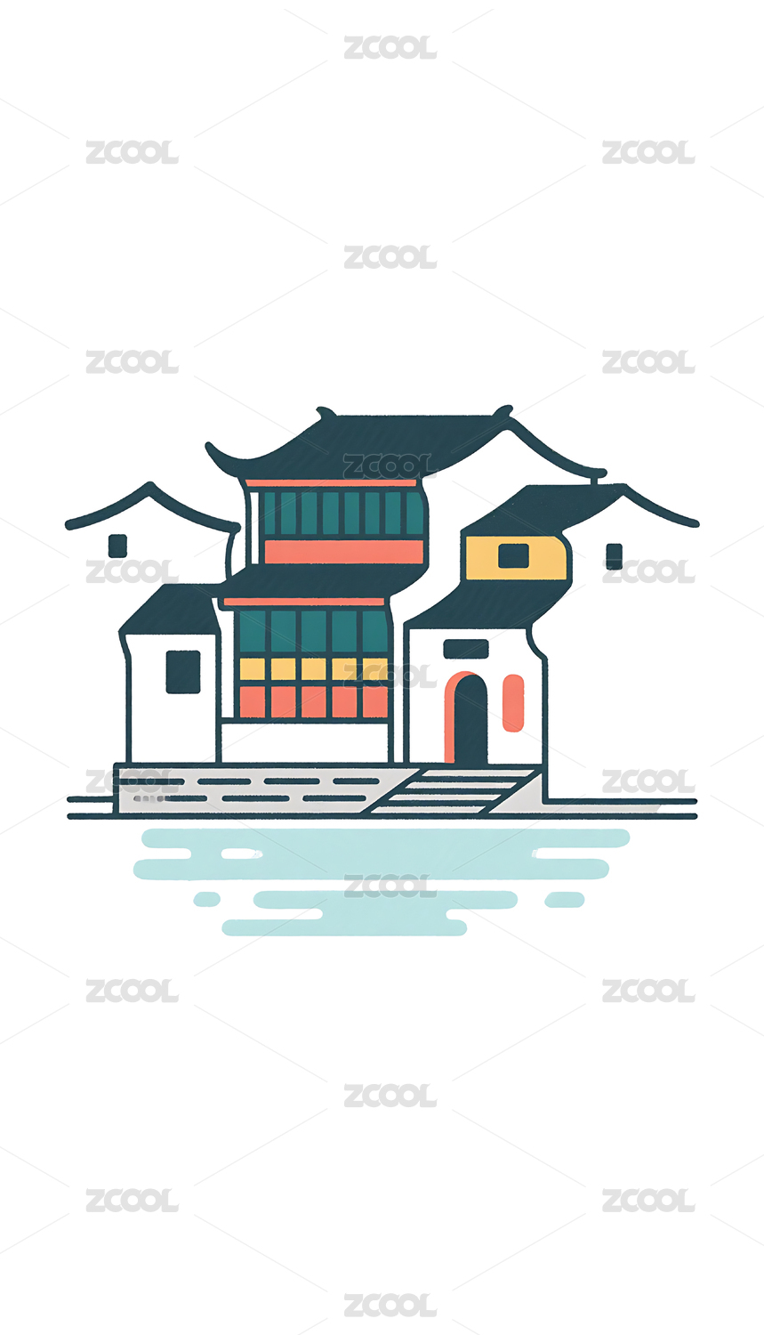 国潮风格,卡通,素材,插画,古建筑,建筑,线稿,简约,江南,江南水乡
