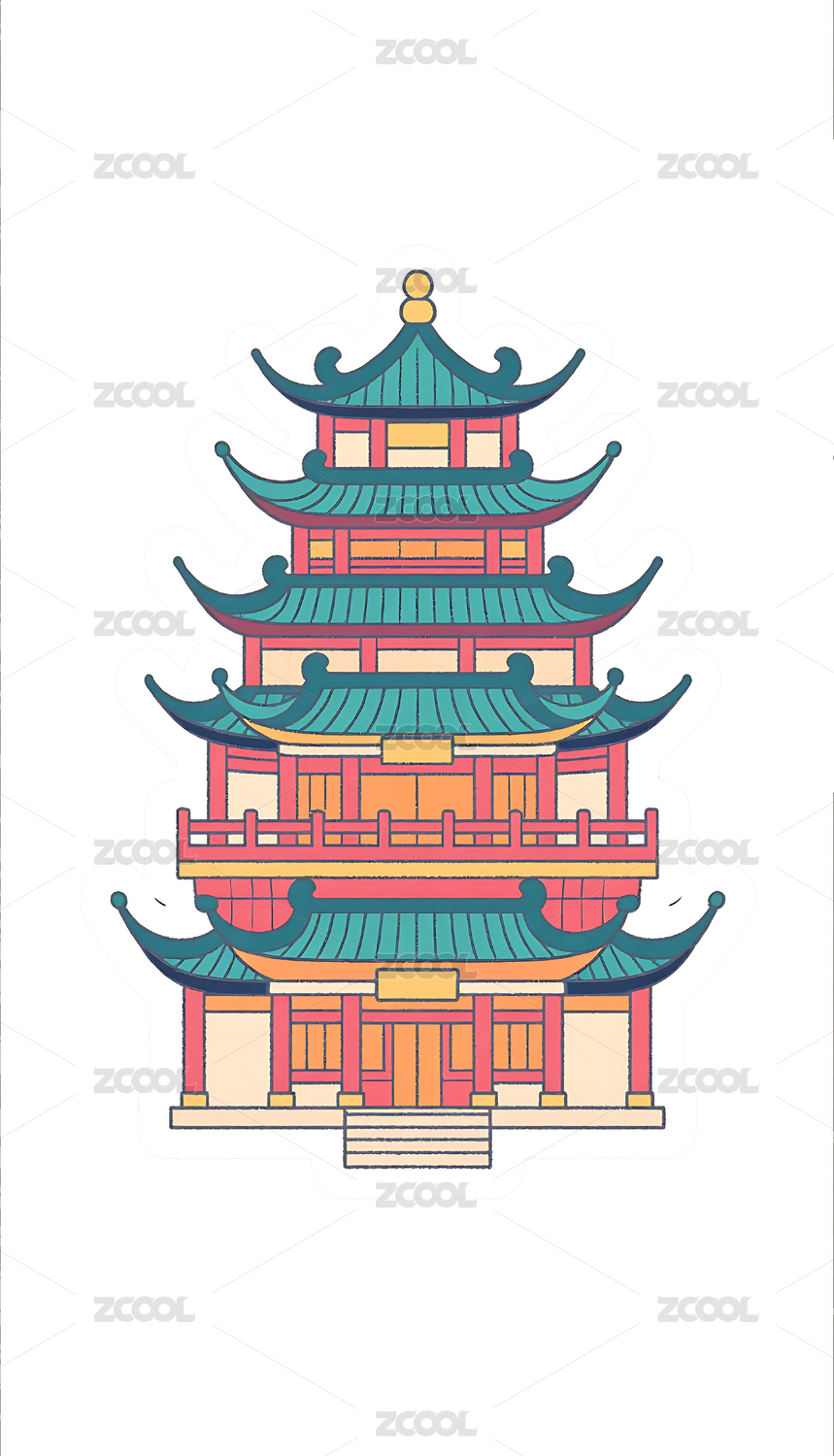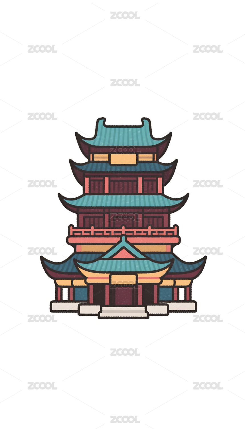 国潮卡通风格古建筑阁楼插画素材