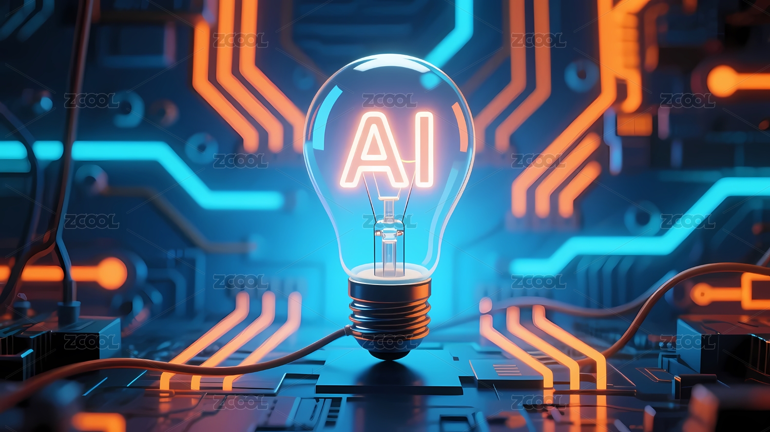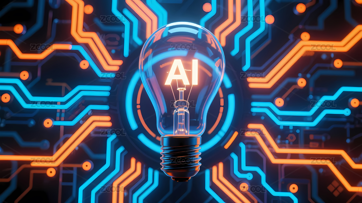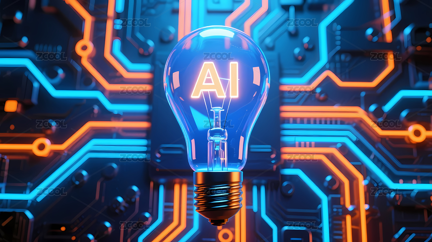 蓝色,背景,科技,图案,橙色,发光,物体,灯泡,AI,电路