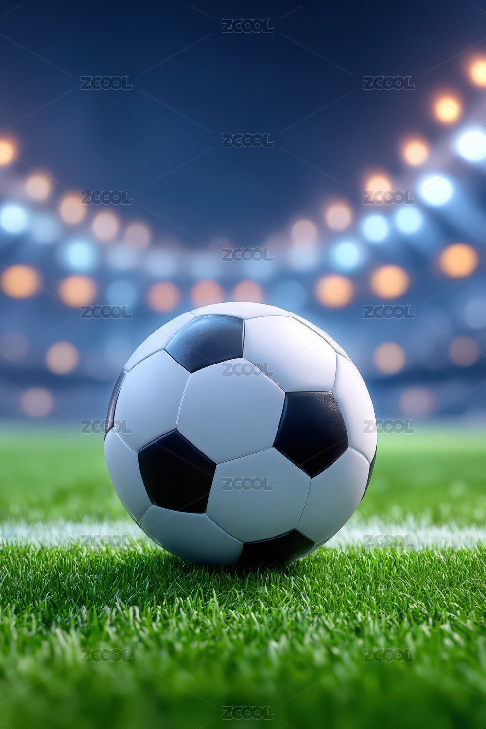 足球场灯光背景下放在草坪上的一颗足球