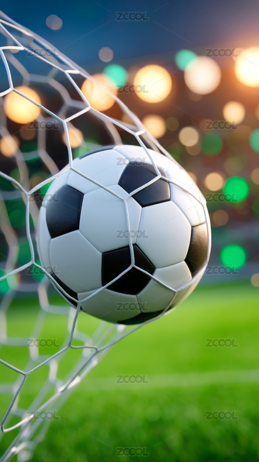足球入网瞬间与明亮球场灯光