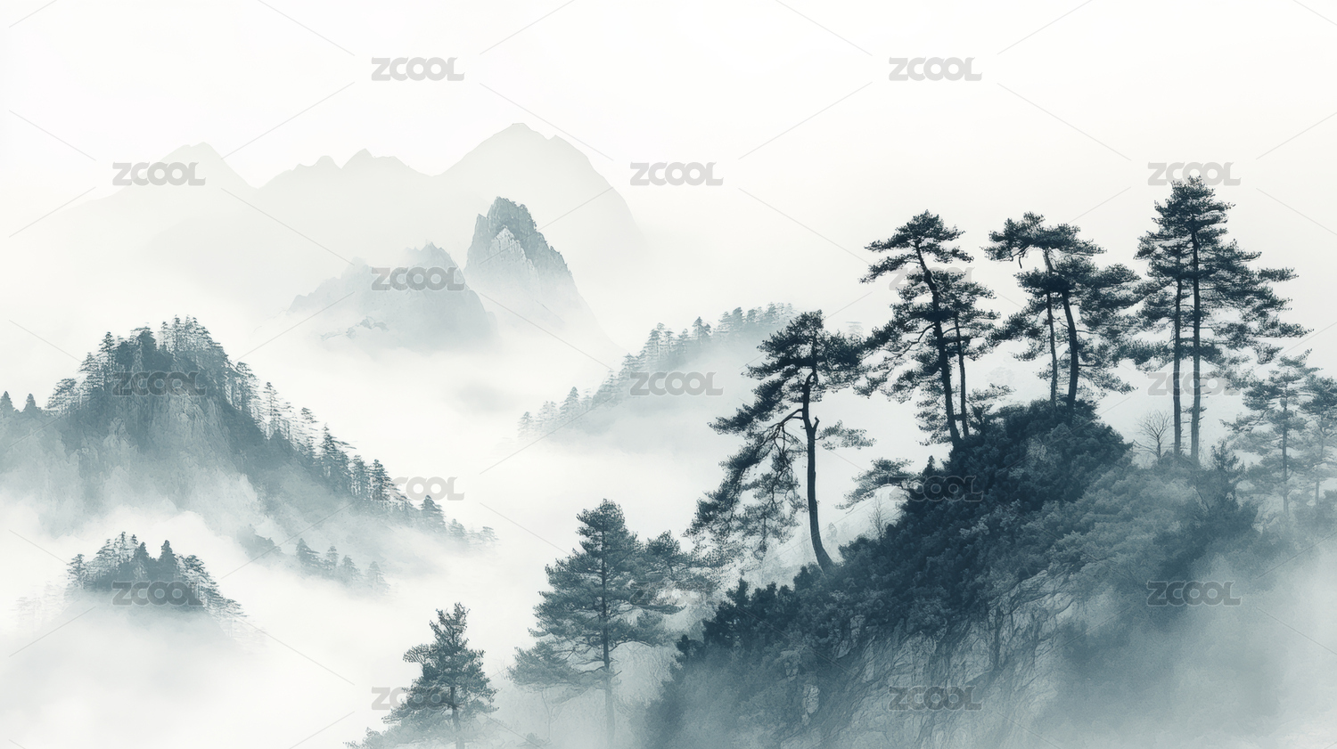 水墨云雾缭绕群山,意境悠远,宁静祥和