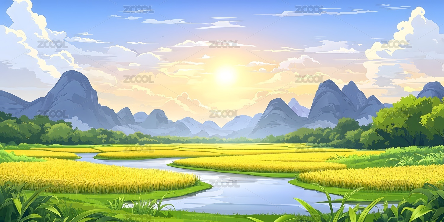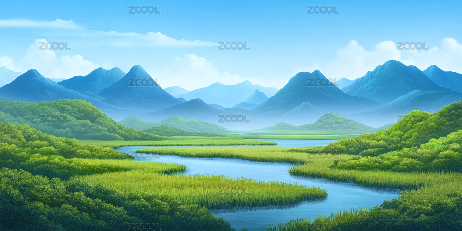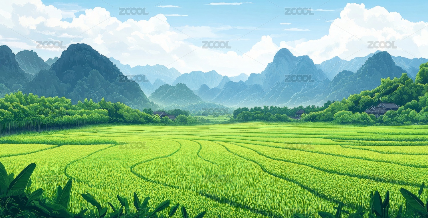 田园绿野山川风景插画