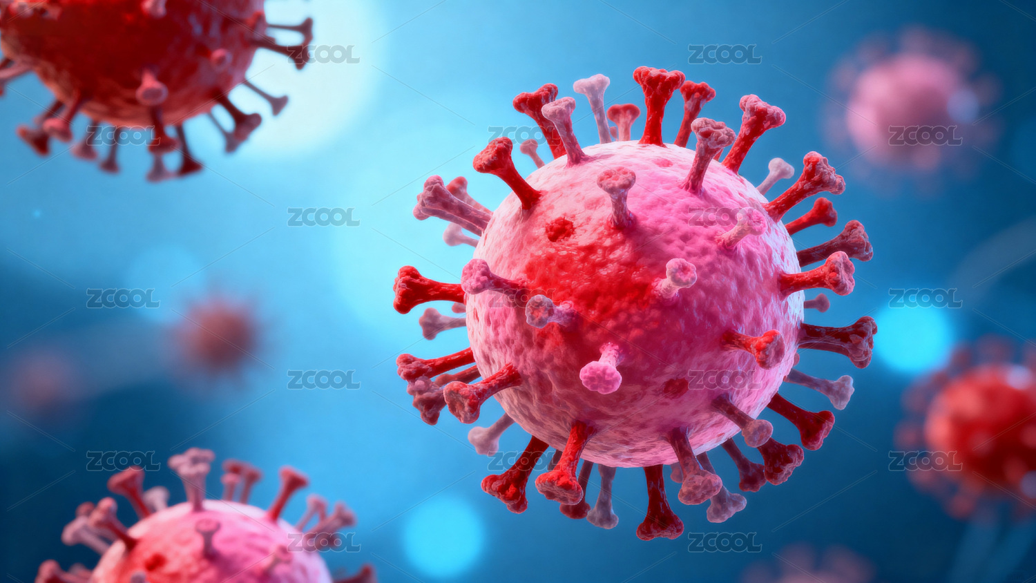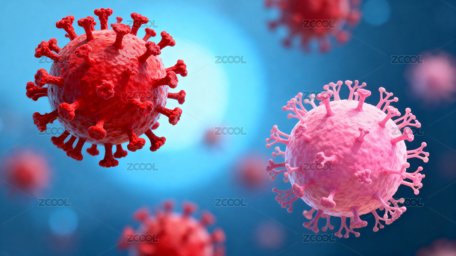 红色与粉色冠状病毒三维结构特写