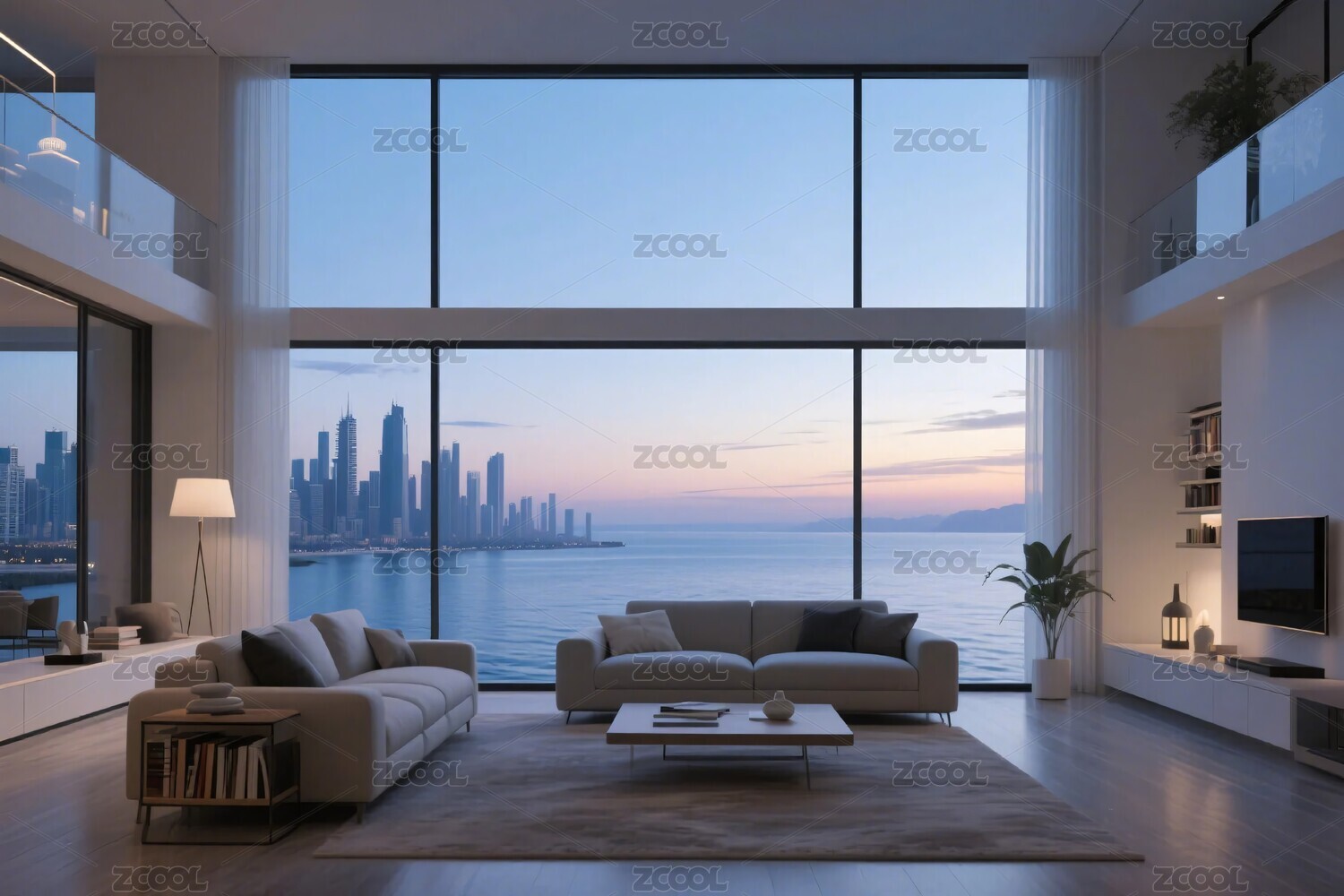 海景,客厅,沙发,落地窗,木质地板,茶几,电视,植物,抱枕,灯