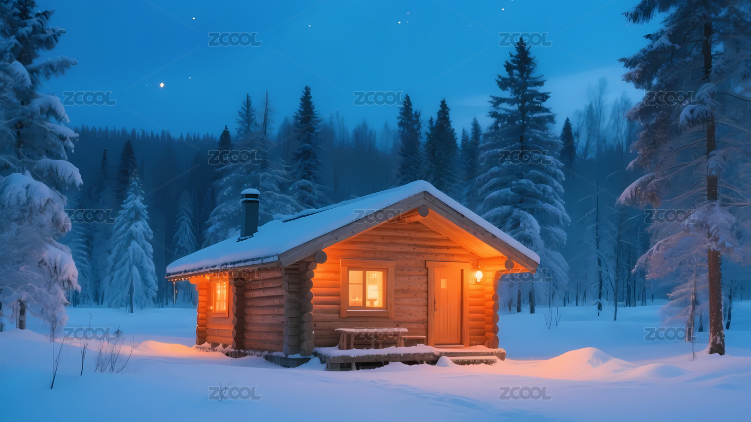 雪地,木屋,灯光,森林,松树,积雪,宁静,寒冷,温暖,自然