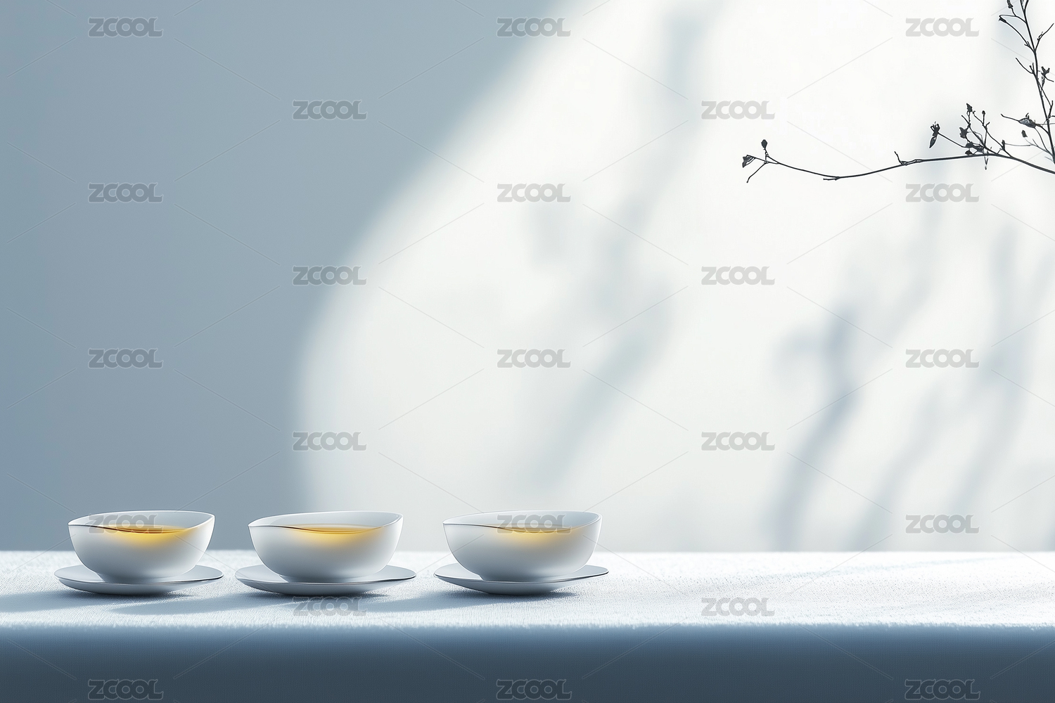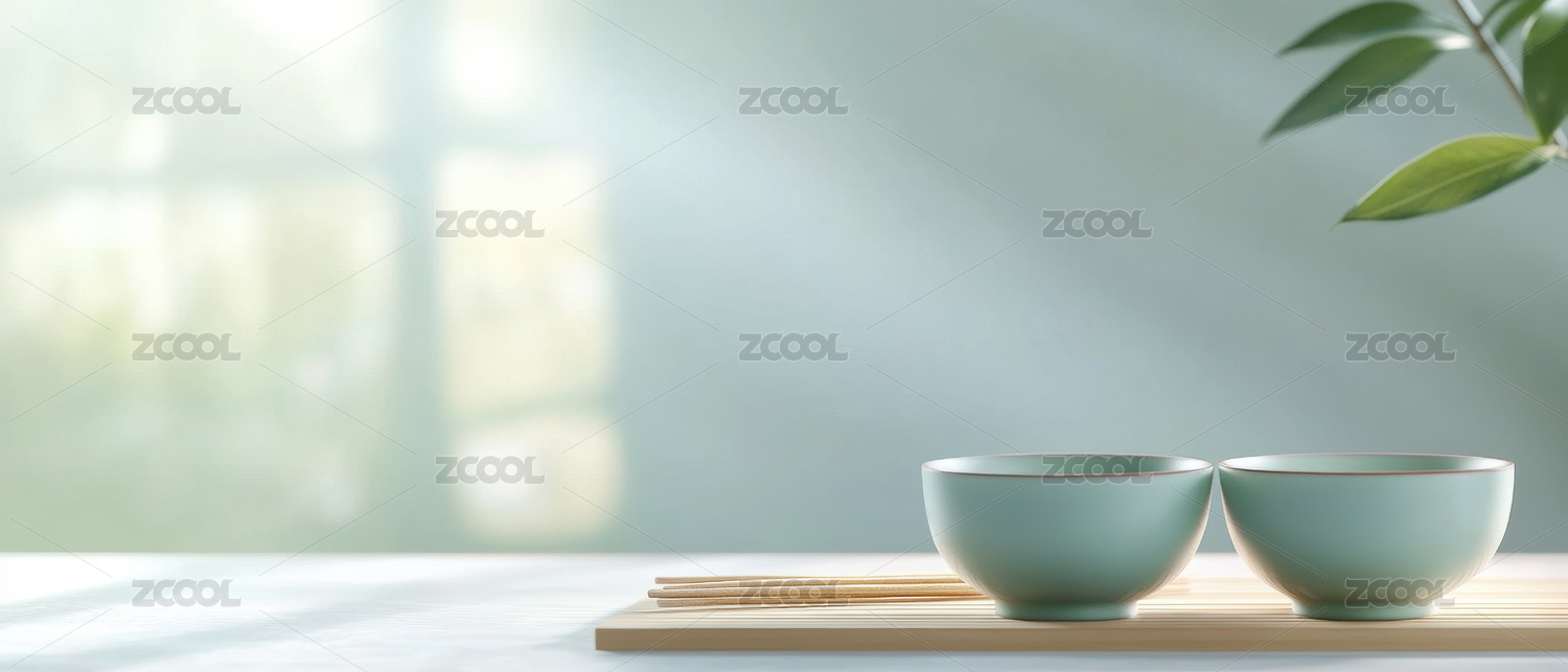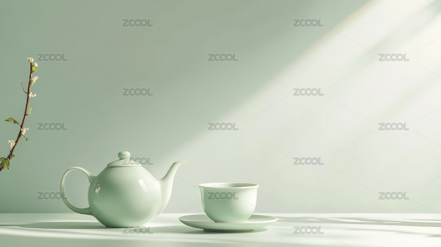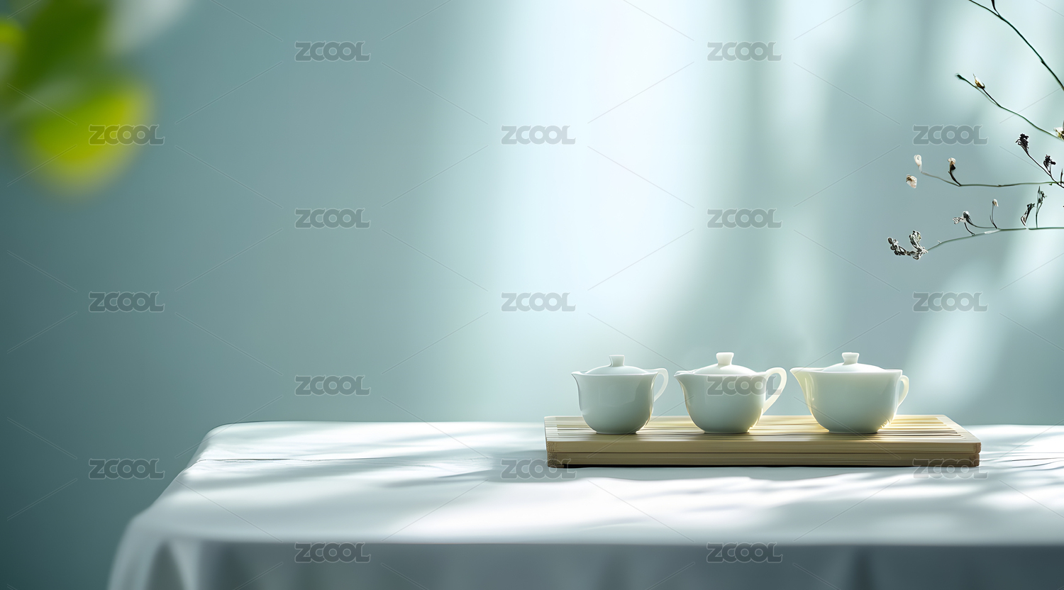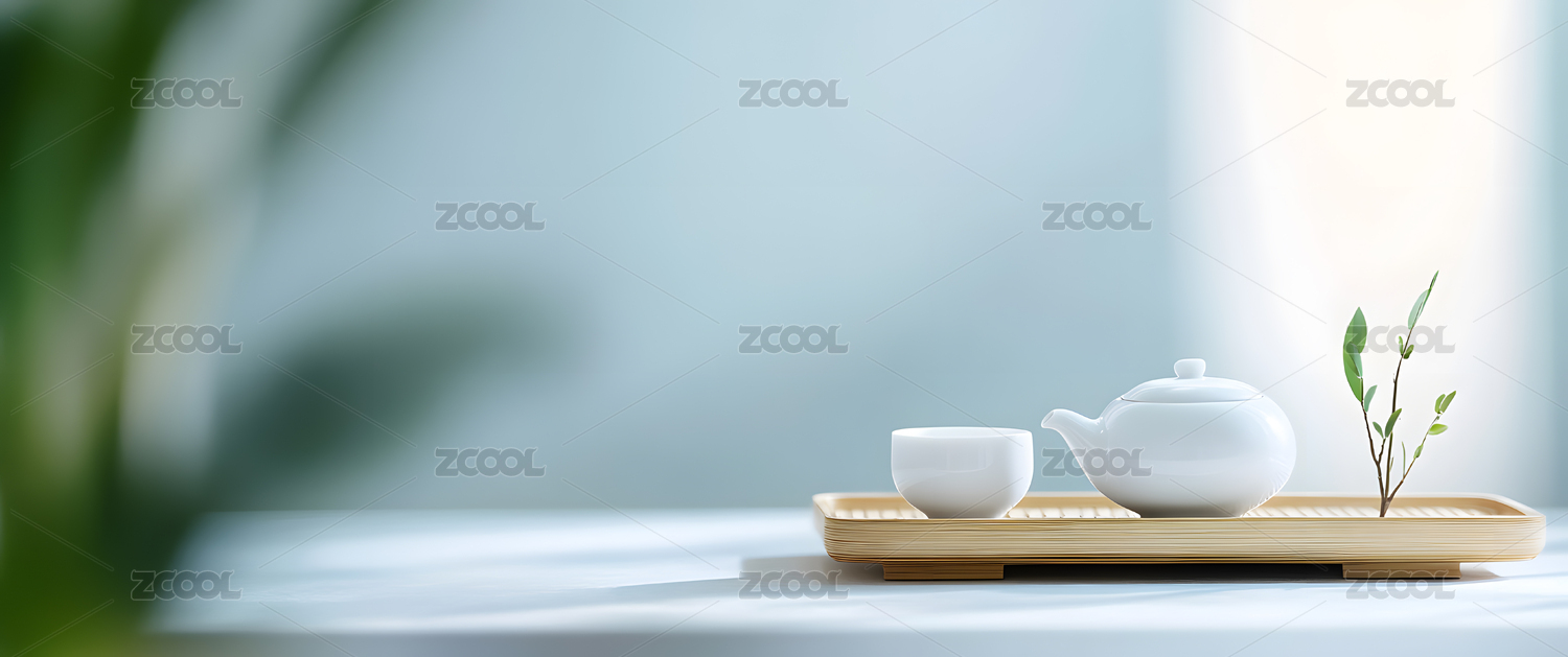 茶具,茶托,茶杯,茶壶,茶叶罐,竹制托盘,阳光,绿色植物,宁静,自然