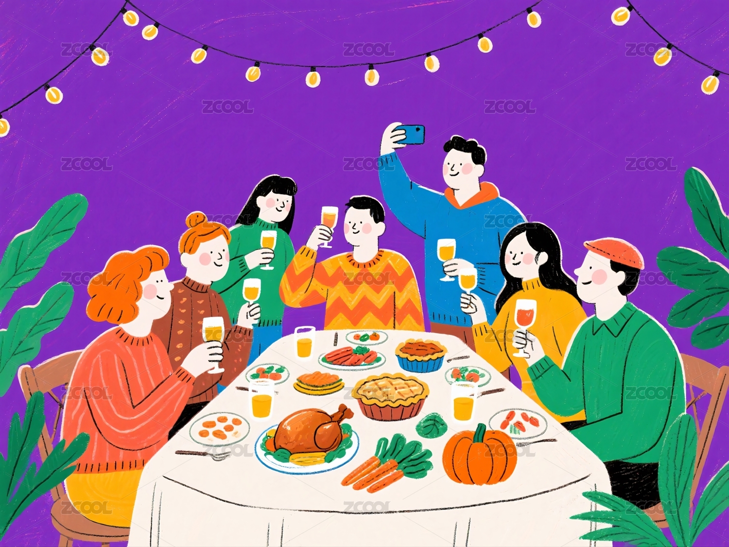 橙黄色卡通温馨一家人围着圆桌吃火鸡祷