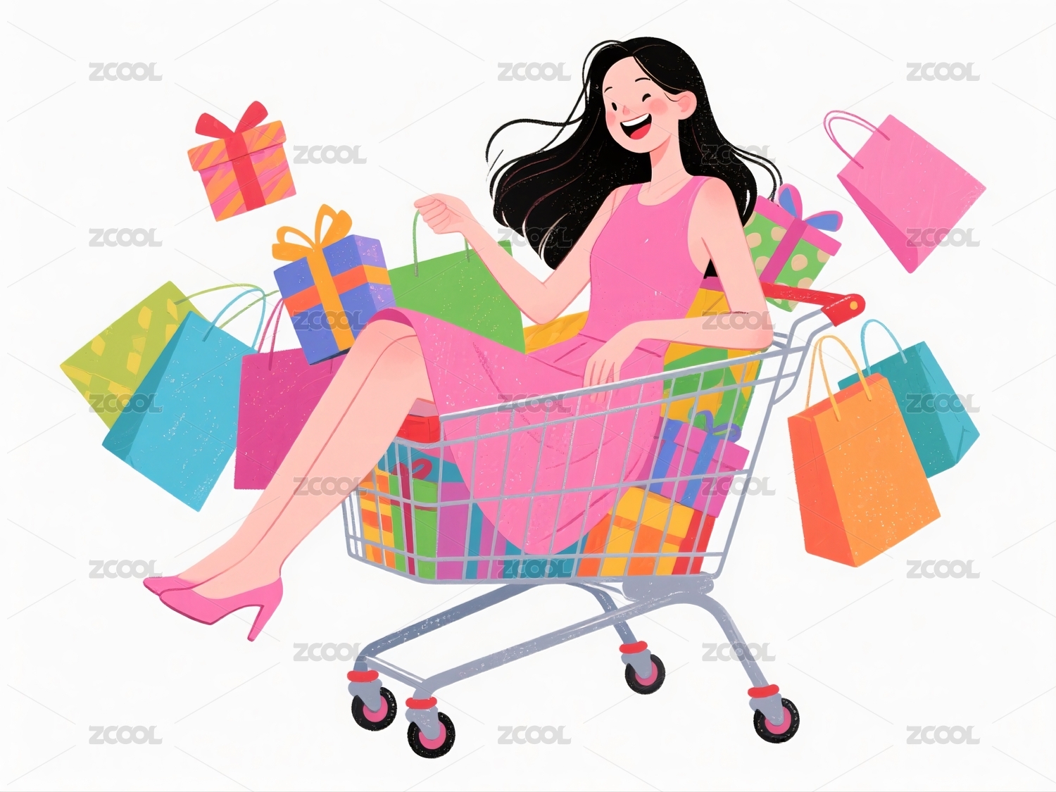 购物女子,礼物盒子,购物袋子,开心微笑,逛街购物,庆祝节日,粉色裙子,时尚风格,快乐心情,购物狂欢