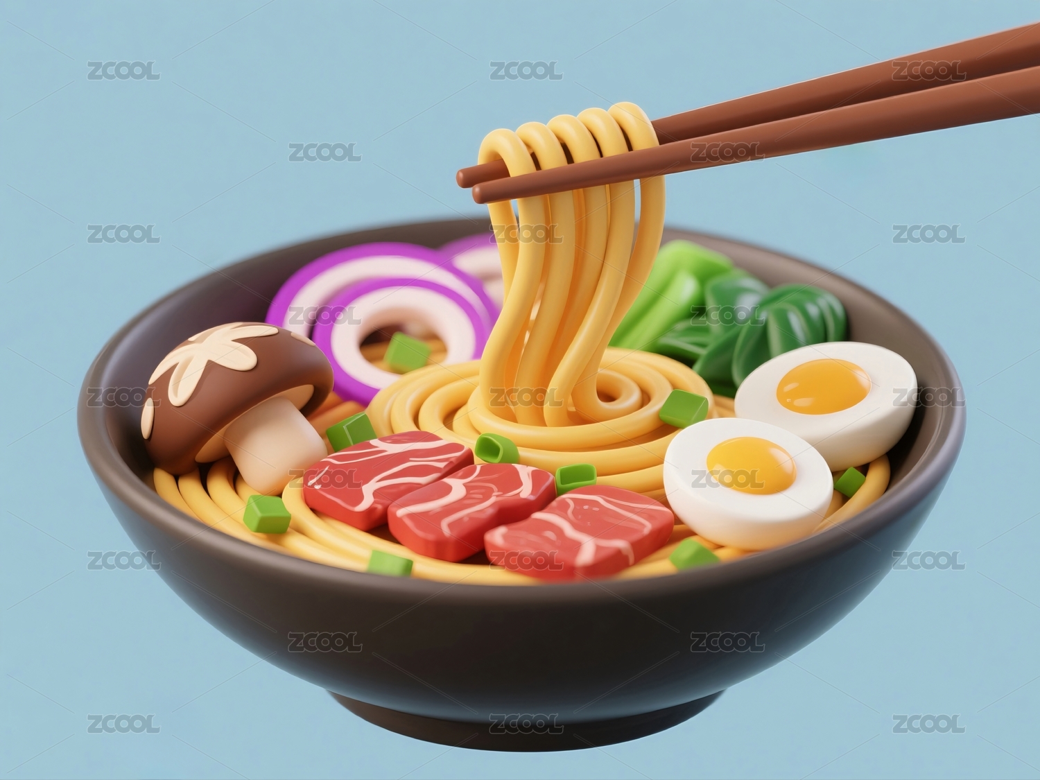 白色背景下火锅里煎蛋牛肉面条食物套餐
