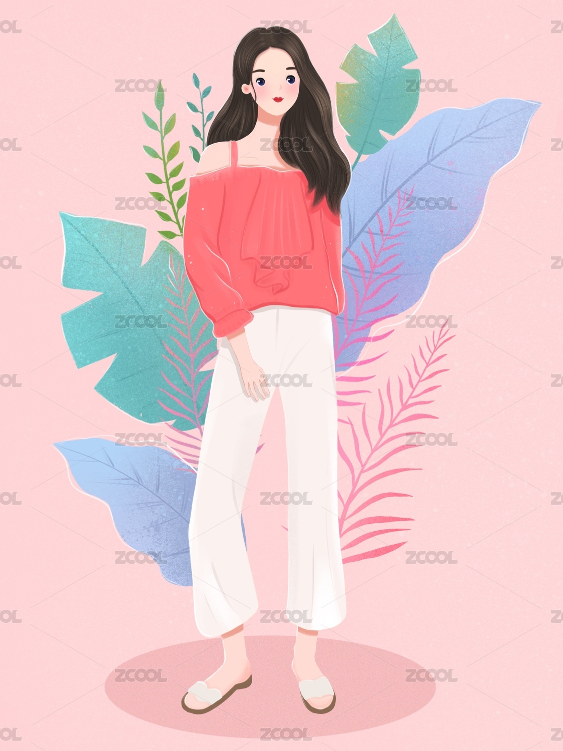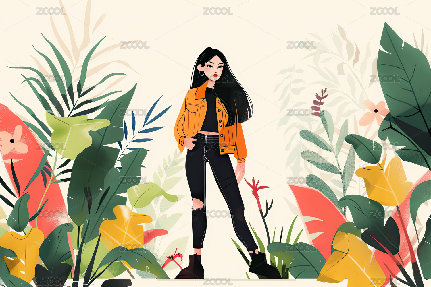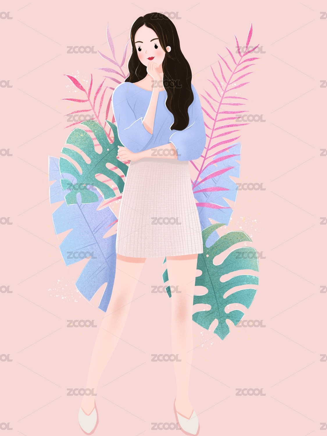 时尚少女植物背景插画