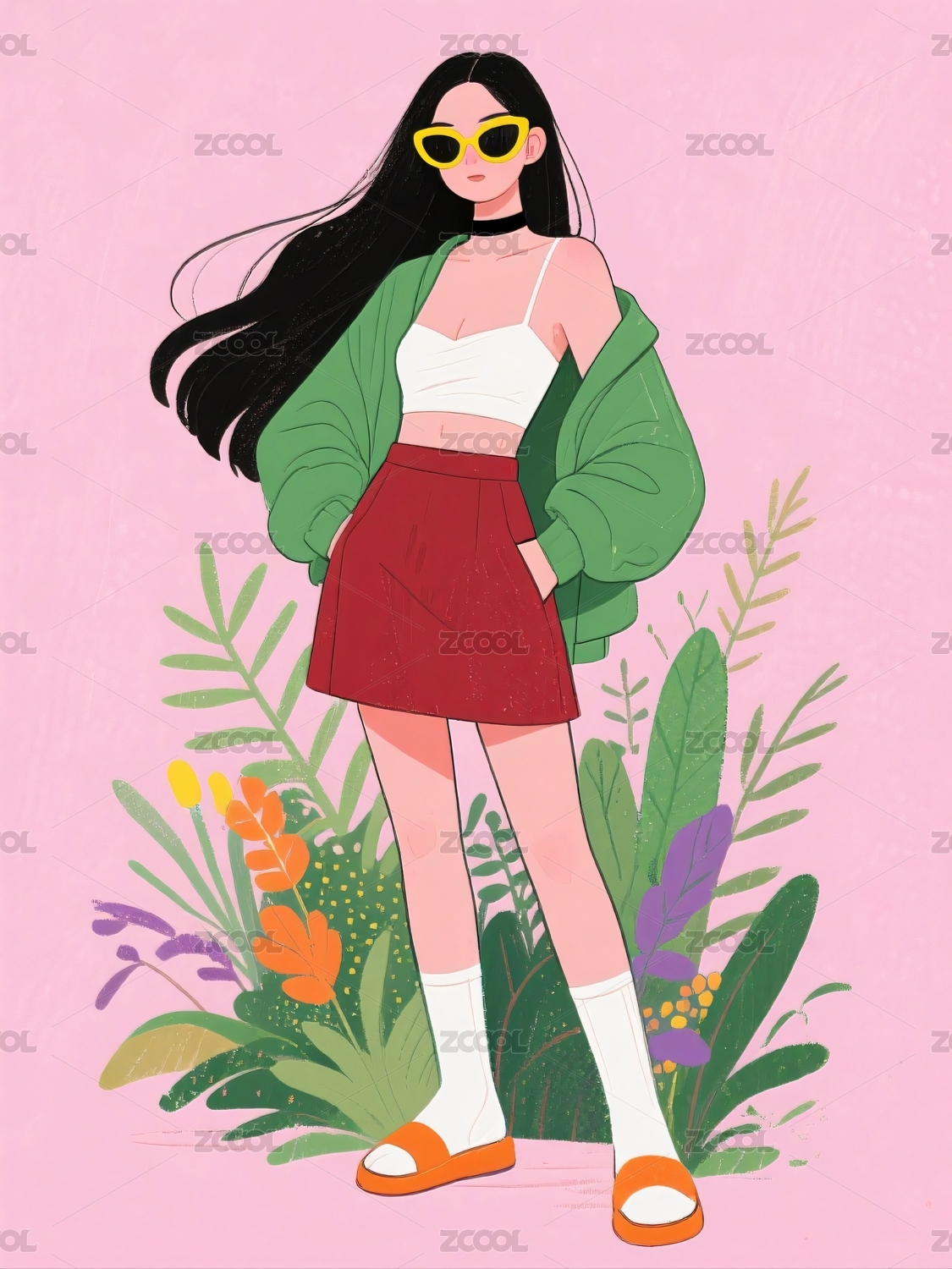 人物,卡通,植物,墨镜,背景,风格,粉色,插画,插画风,人物画