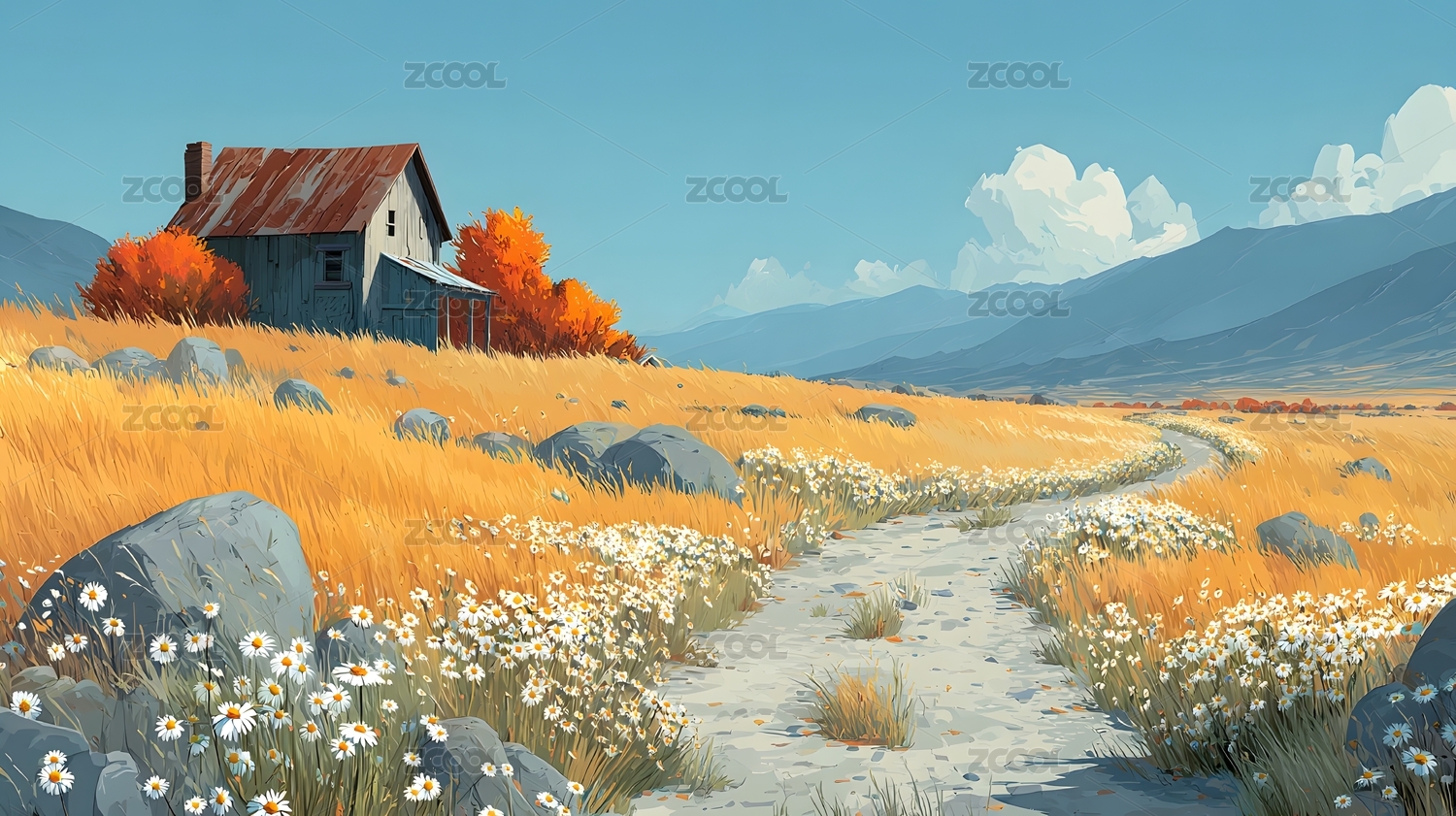 田野,树木,云朵,房屋,草地,金黄,远山,蓝天,飞鸟,乡村