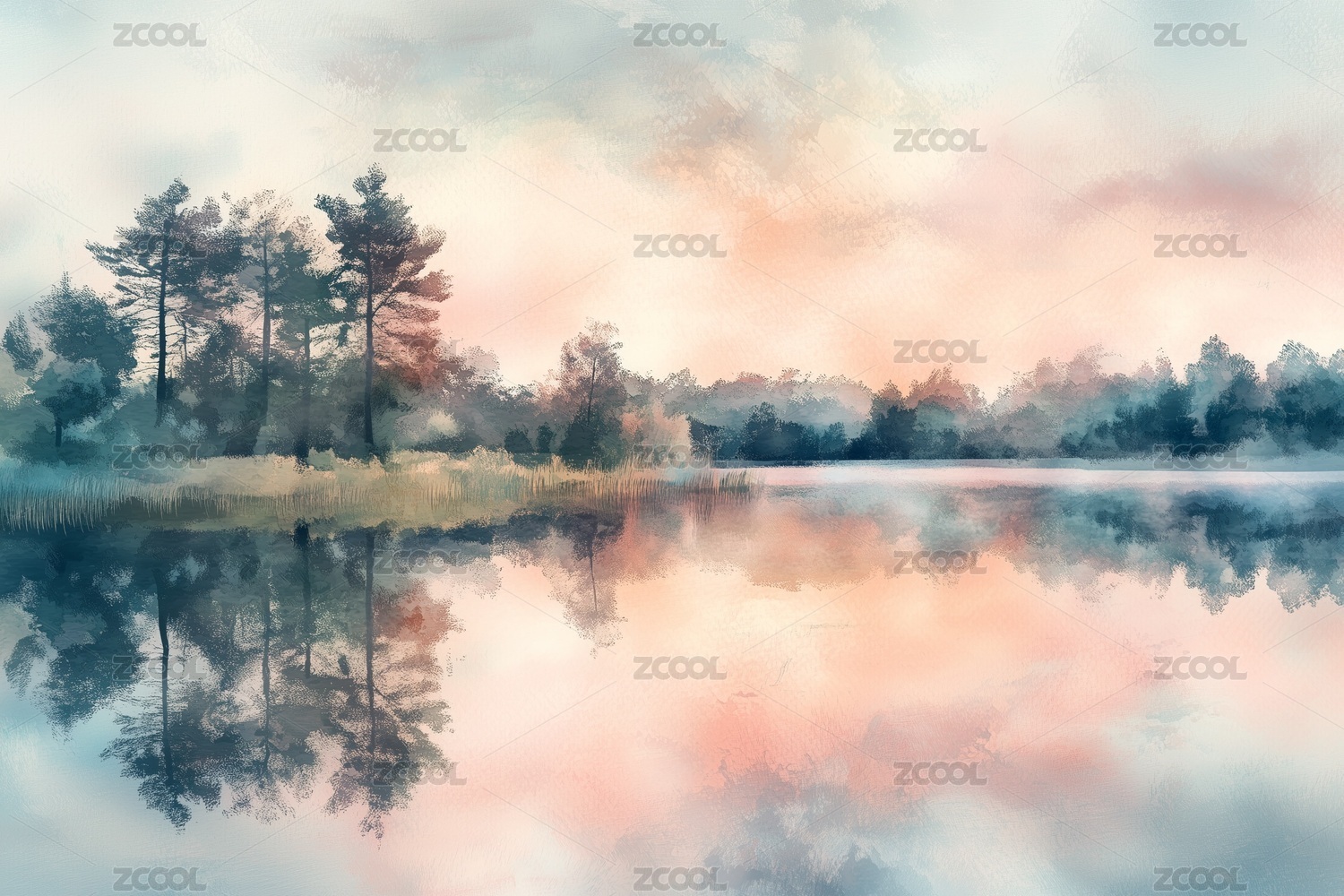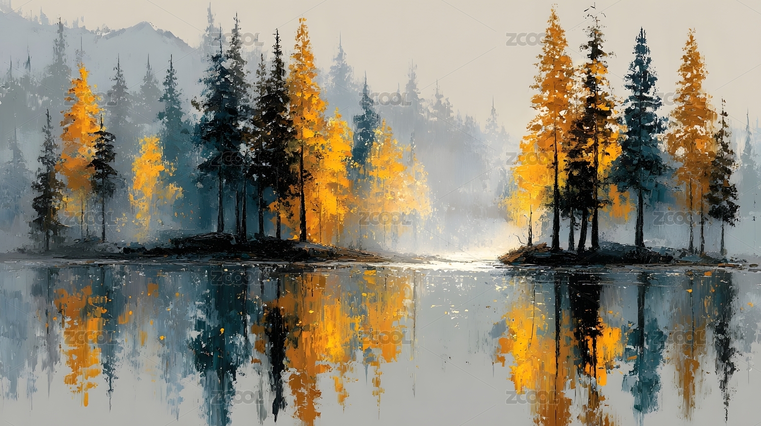 树木,远山,森林,松树,薄雾,光晕,树影,雾气,湖泊,倒影