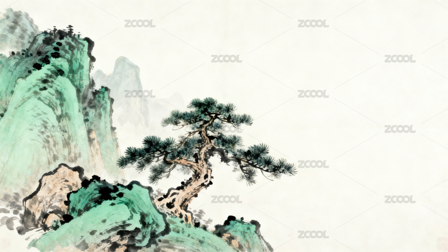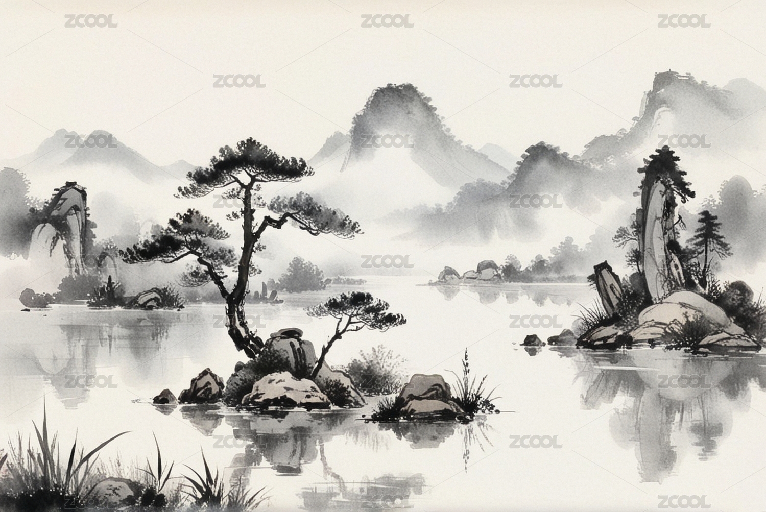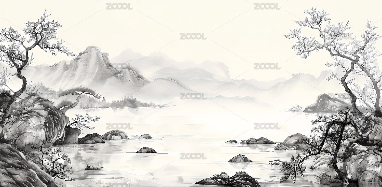 山水,树木,云雾,山峰,松树,亭子,房屋,小船,河流,建筑