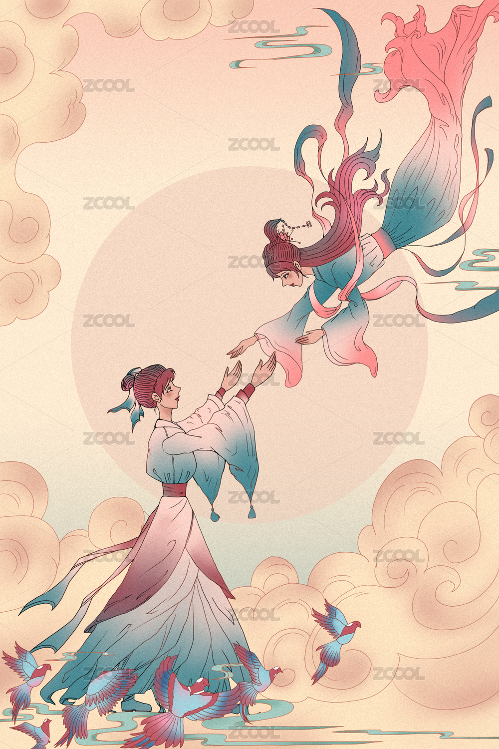 中国爱情传说牛郎织女七夕荷花流云国潮插画