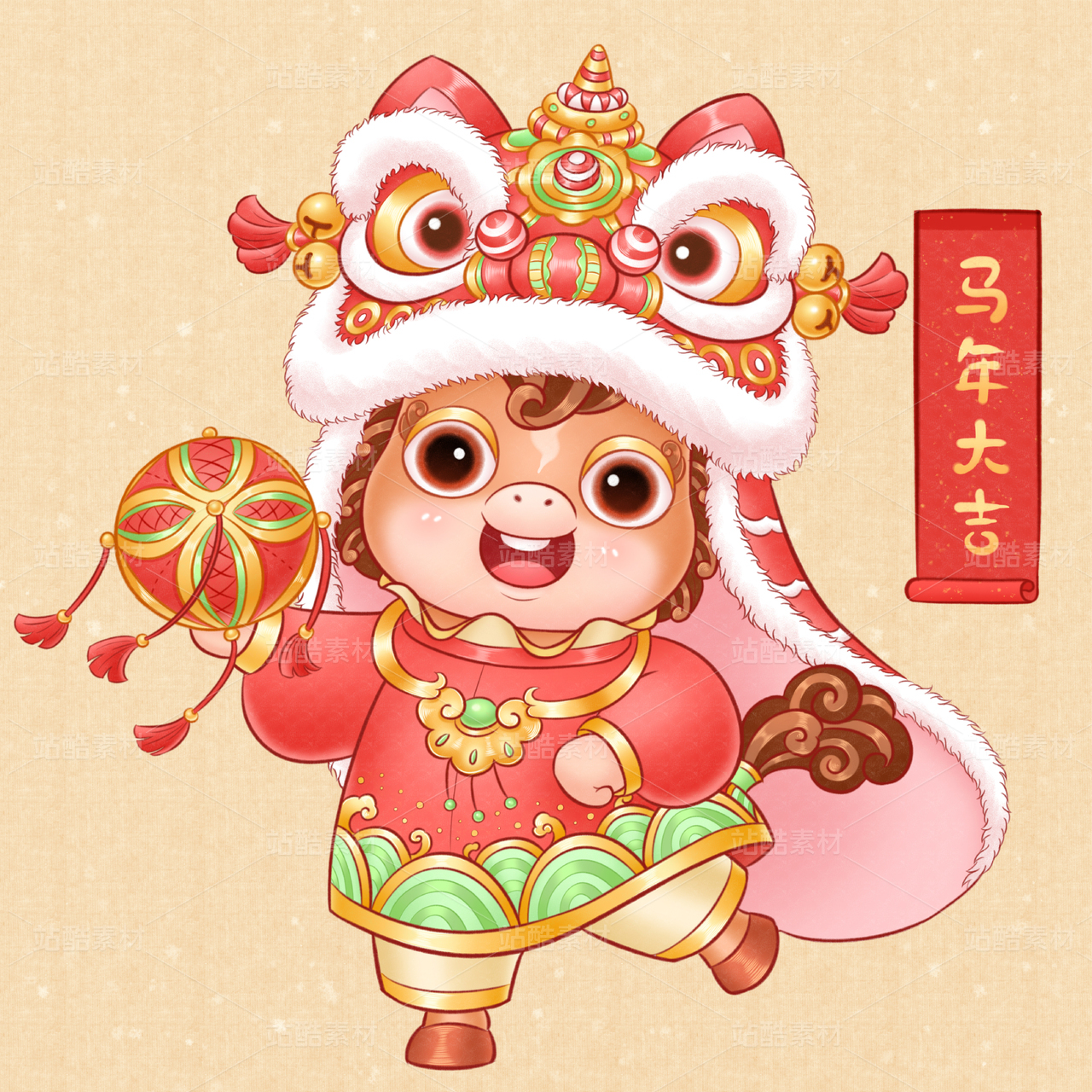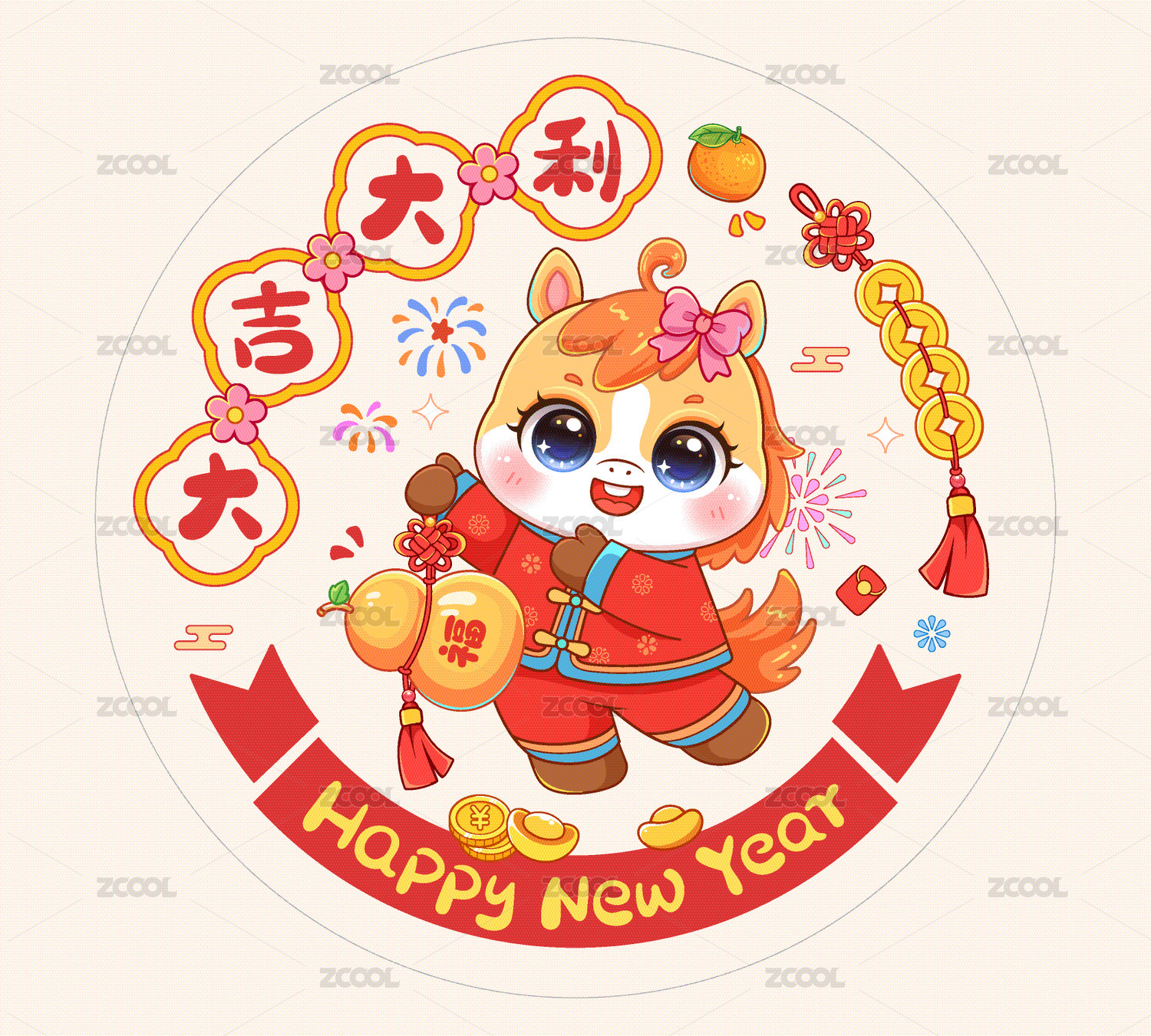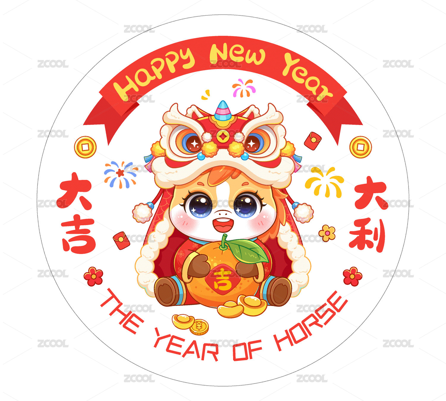 马年抱橘子喜庆窗花插画