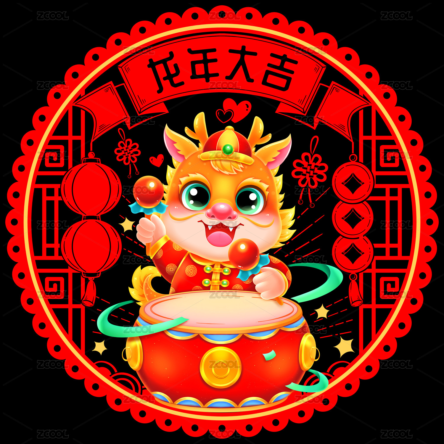 传统龙年大吉打鼓窗花