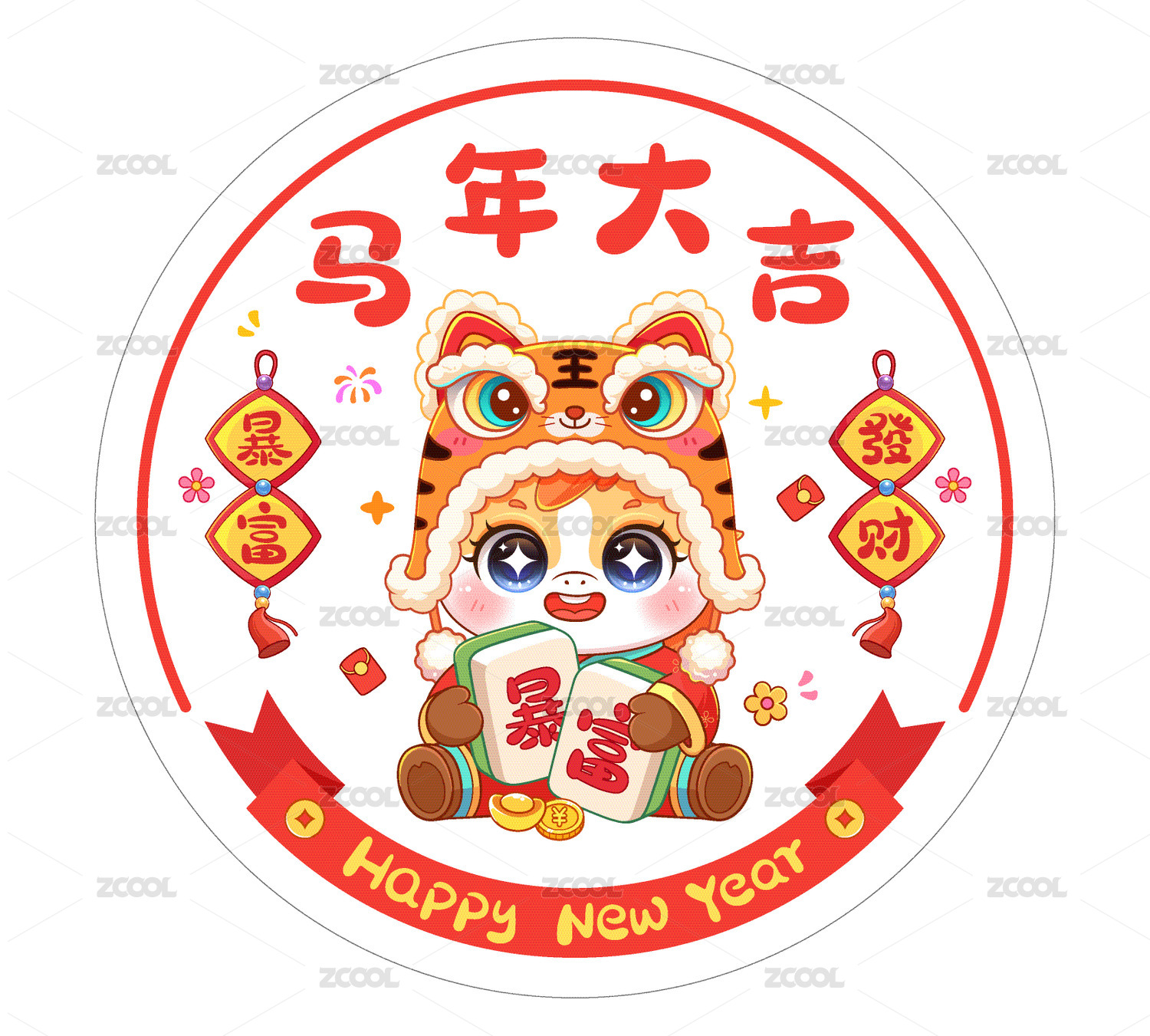 马年抱麻将喜庆窗花插画