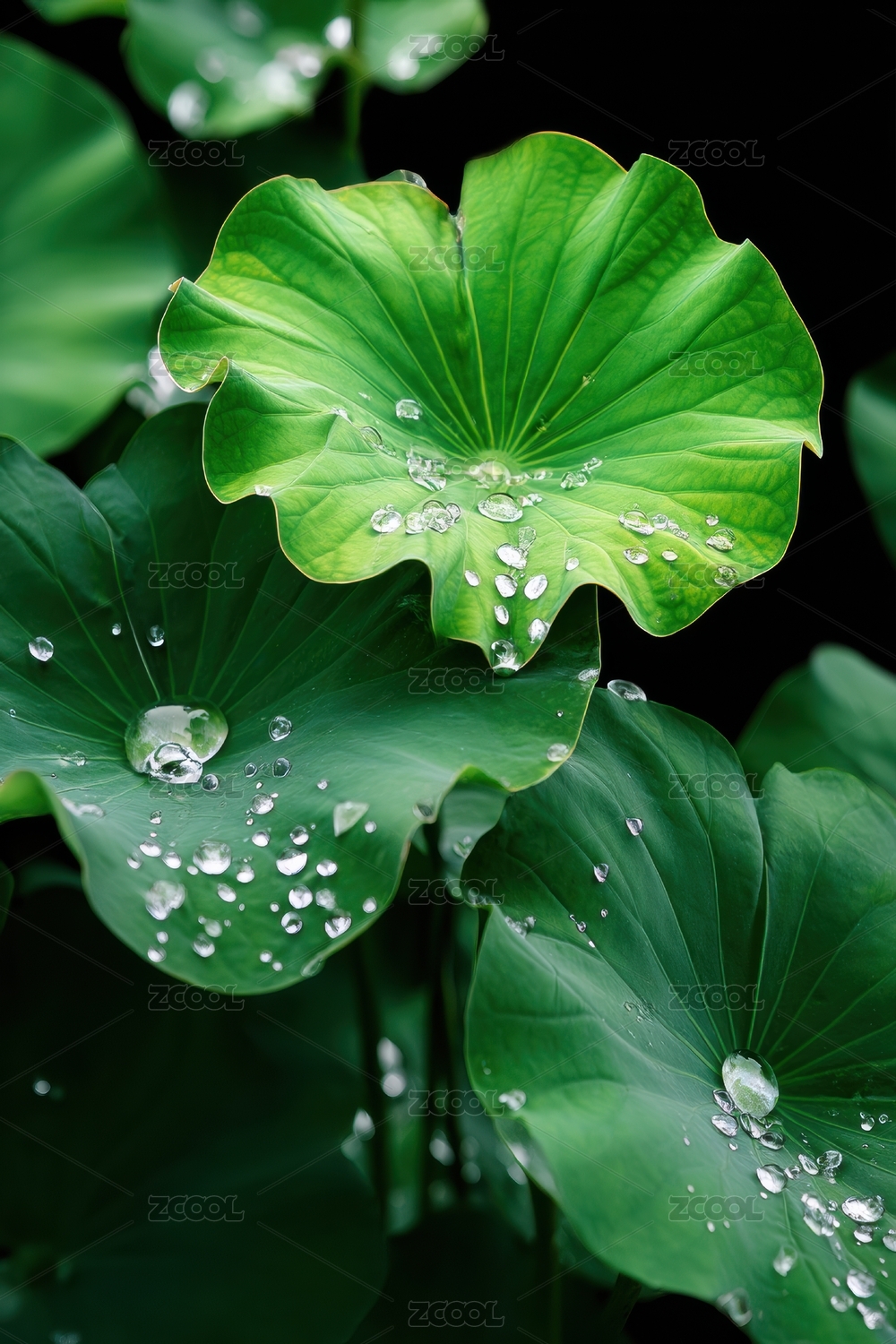 晶莹露珠点缀翠绿荷叶的静谧美景