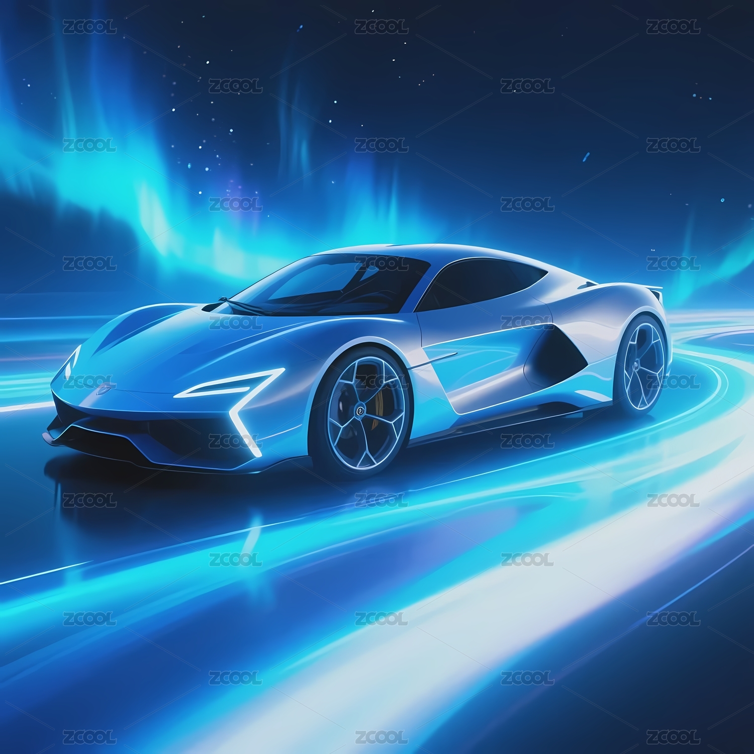 蓝色跑车在极光下疾驰