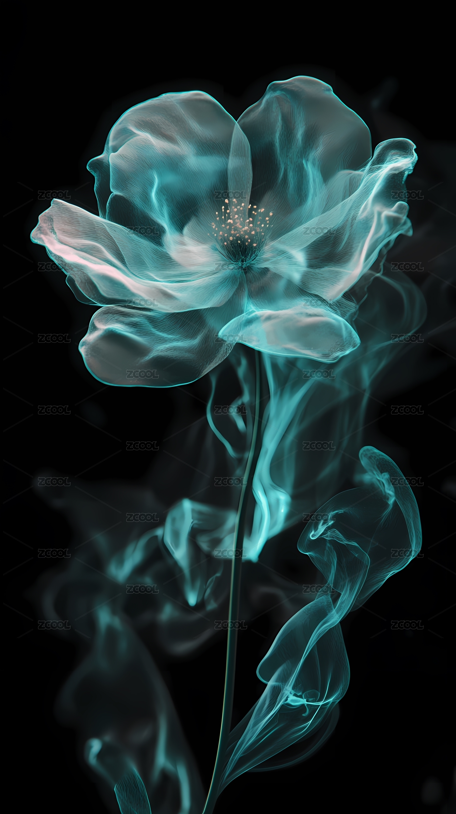黑白烟雾中绽放的透明百合花