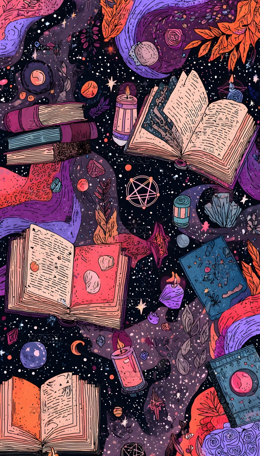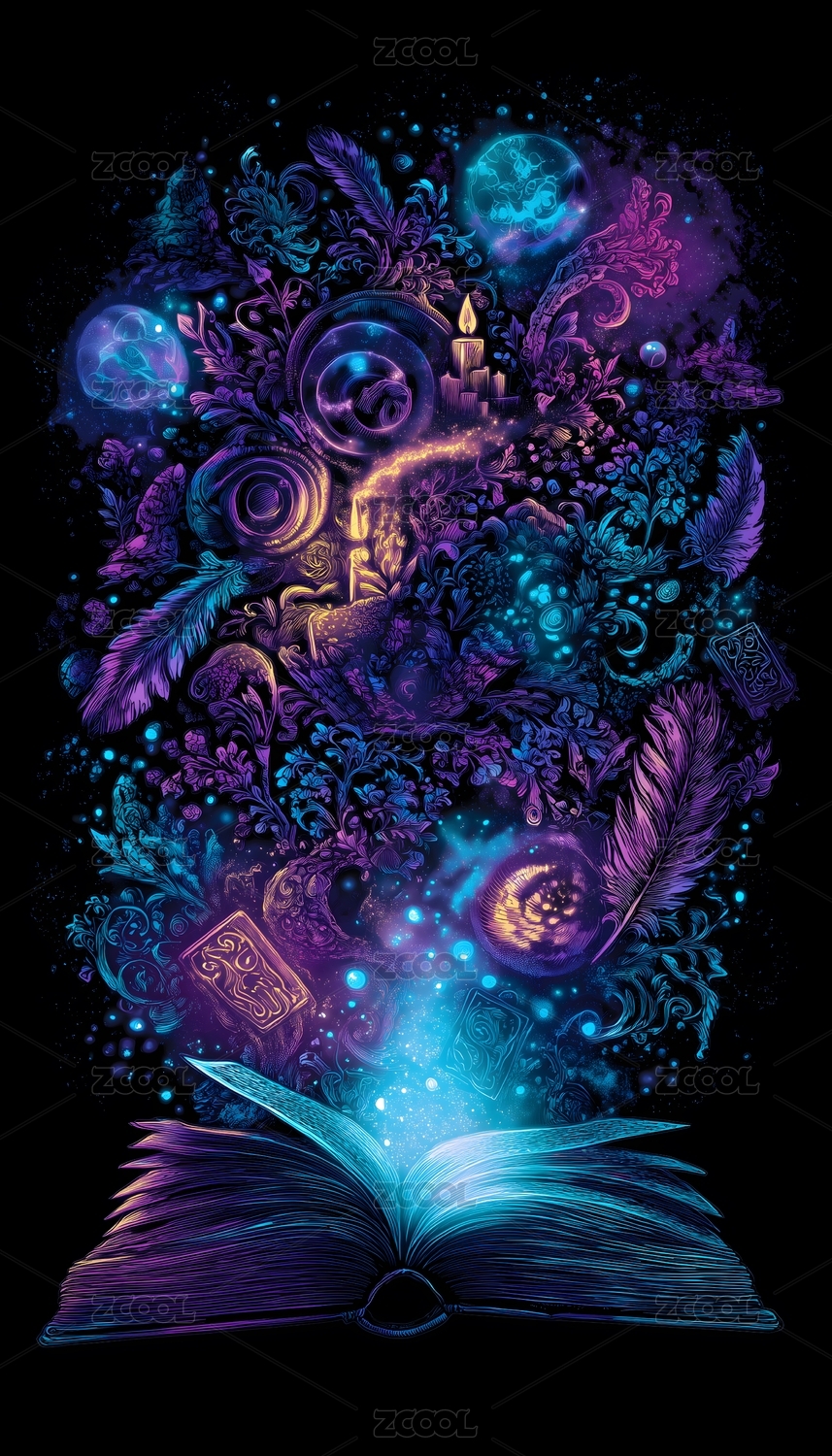 奇幻魔法书与星空能量流插画