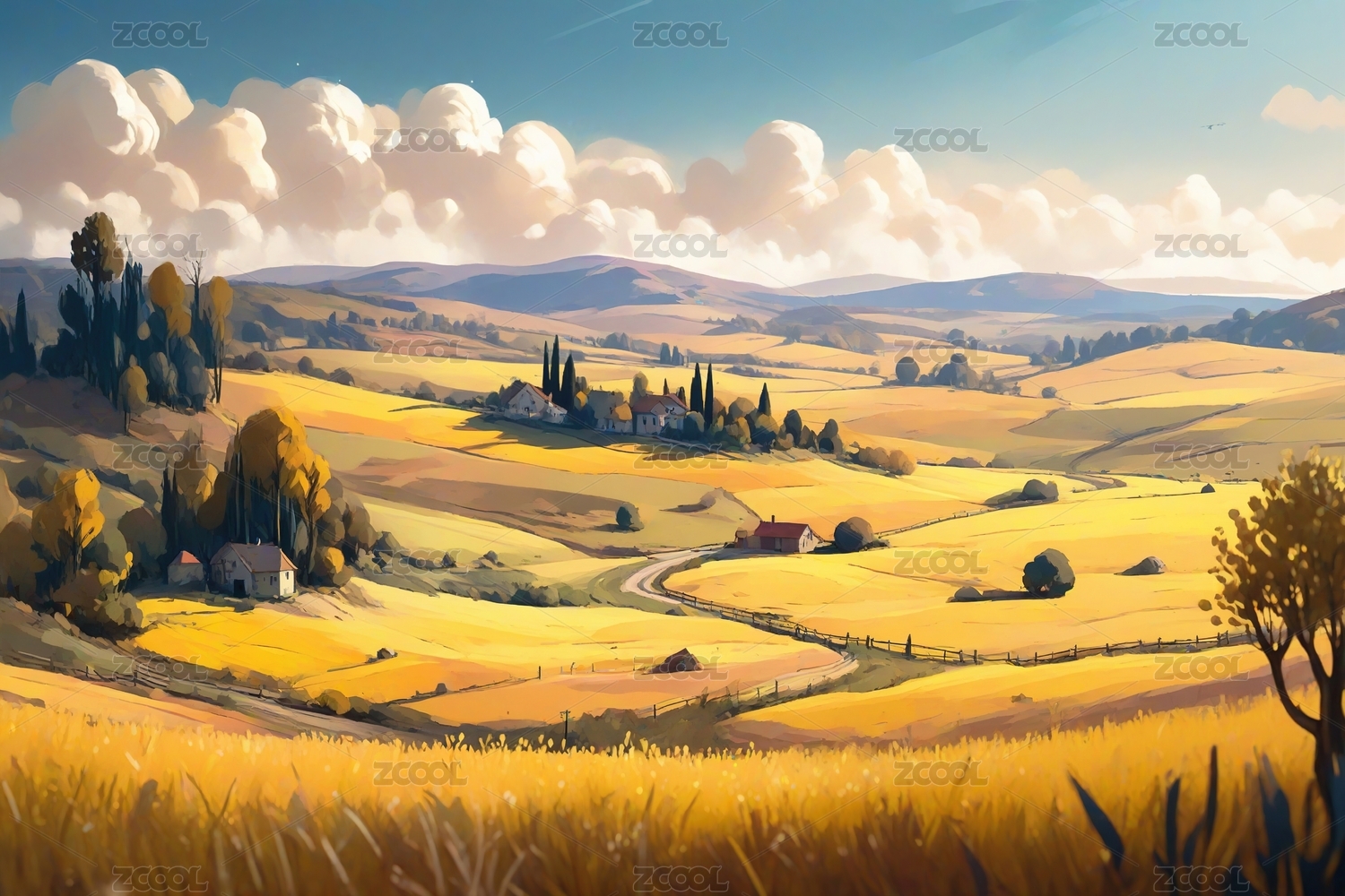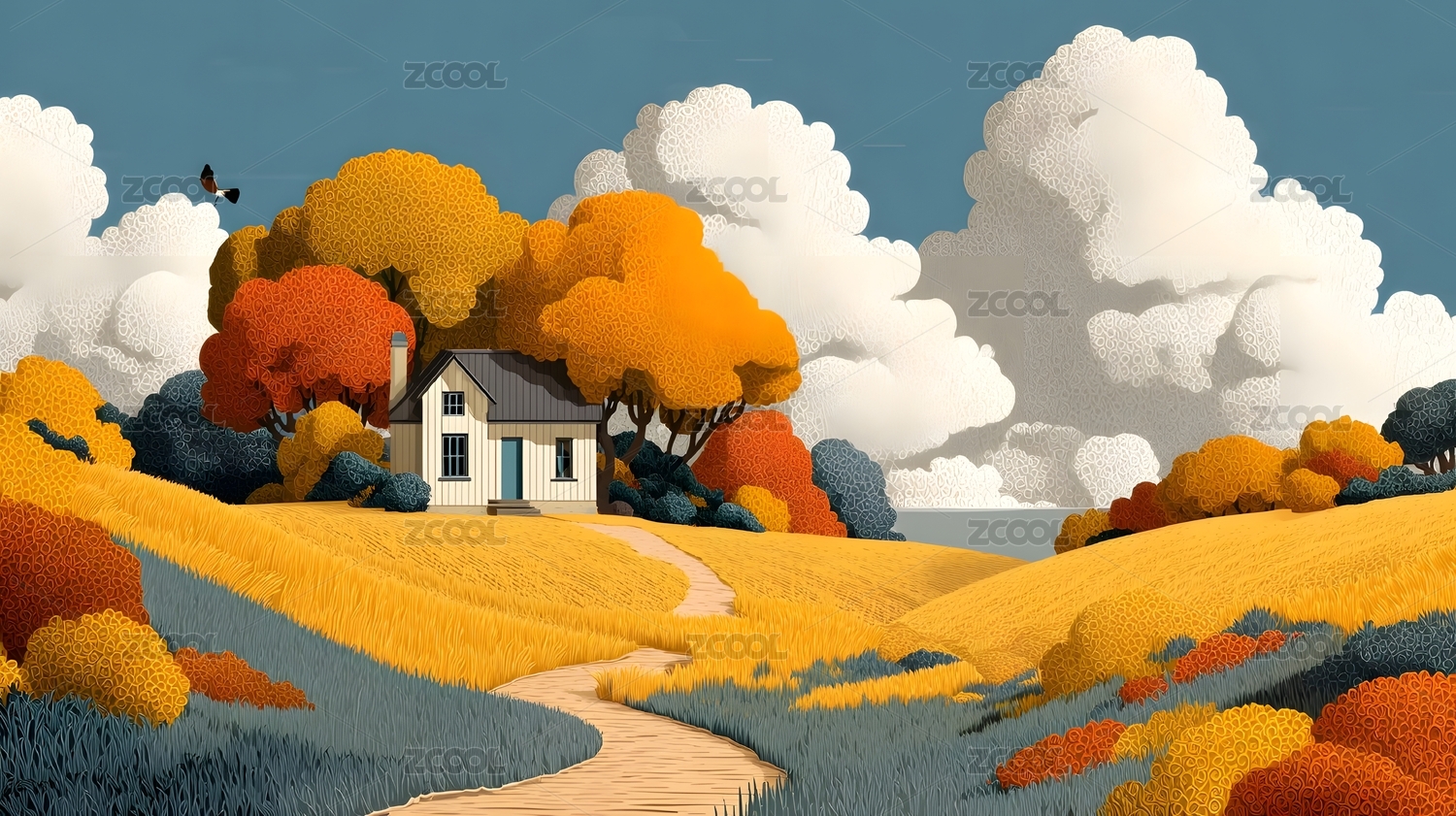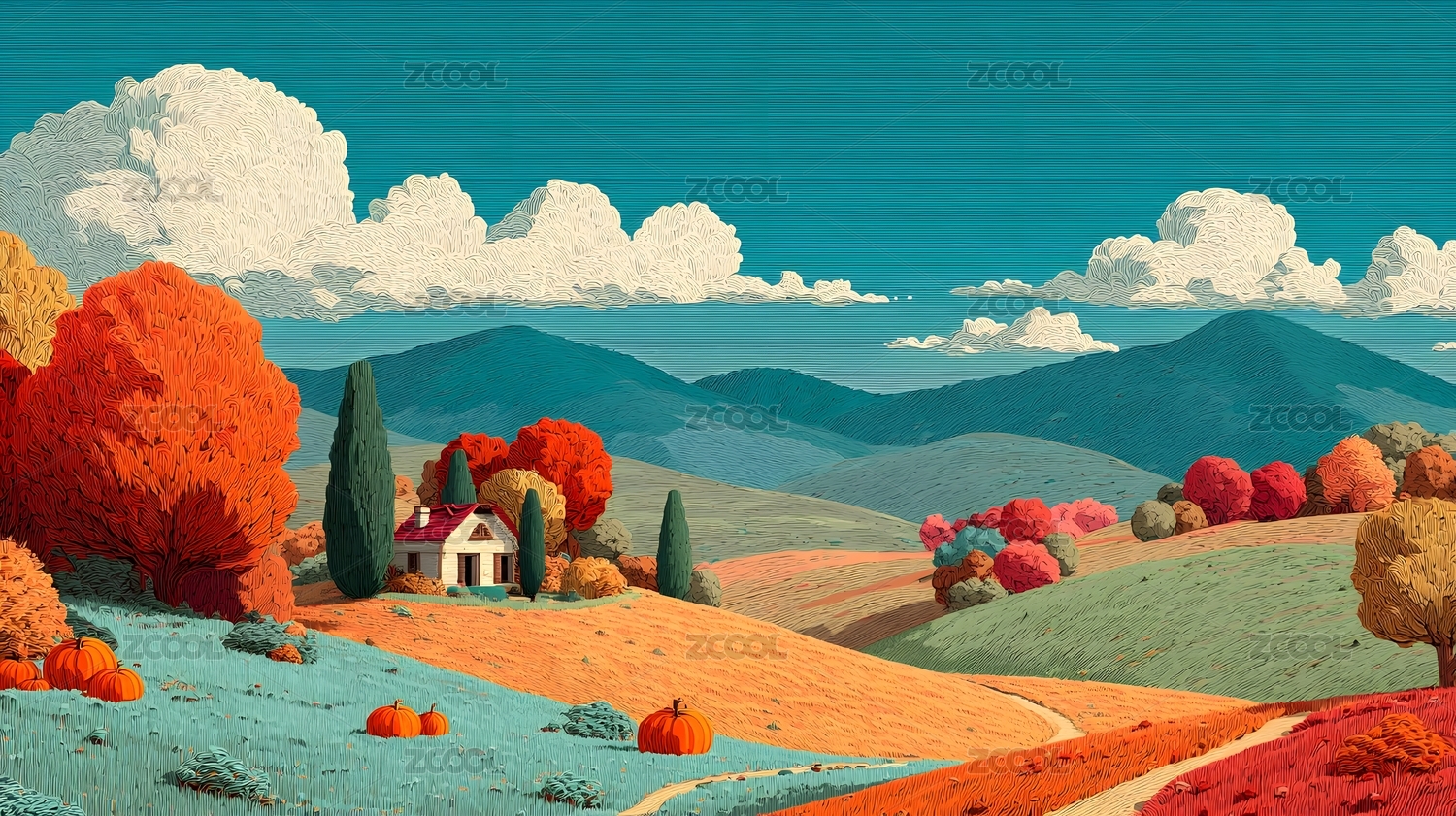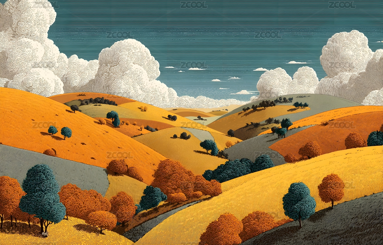 金秋山丘云彩飘,艺术风景画