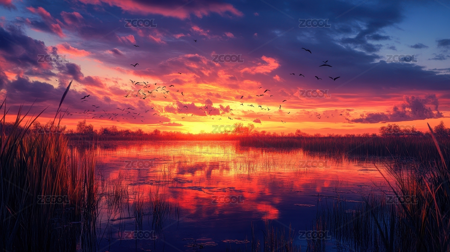 静谧湿地落日美景