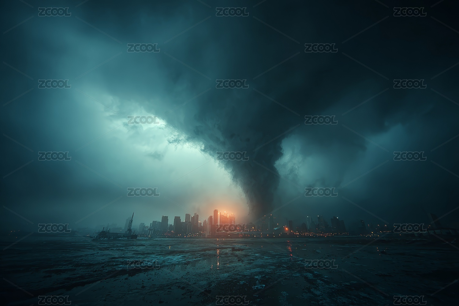 大海海面上巨大水龙卷风和海浪闪电恶劣天气