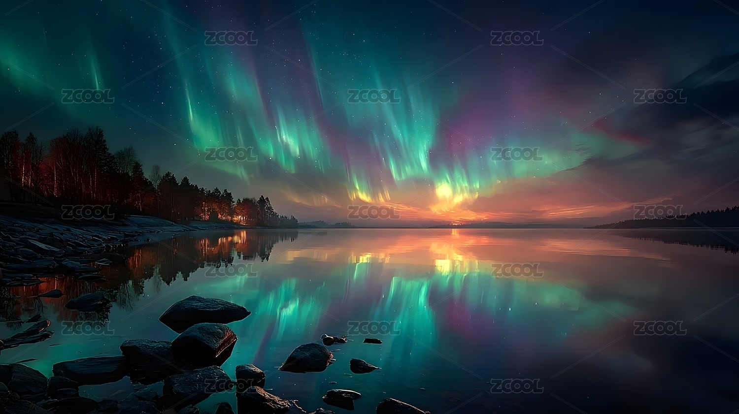 极光倒影在静谧湖面