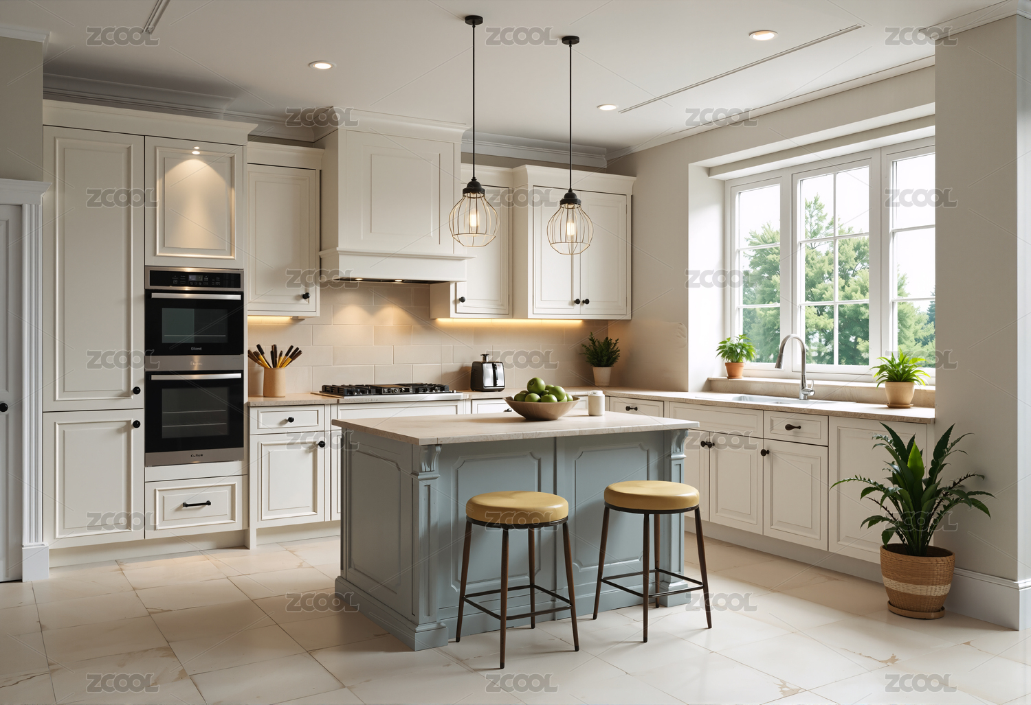 明亮,厨房,橱柜,现代,植物,椅子,灶台,窗户,家居,室内