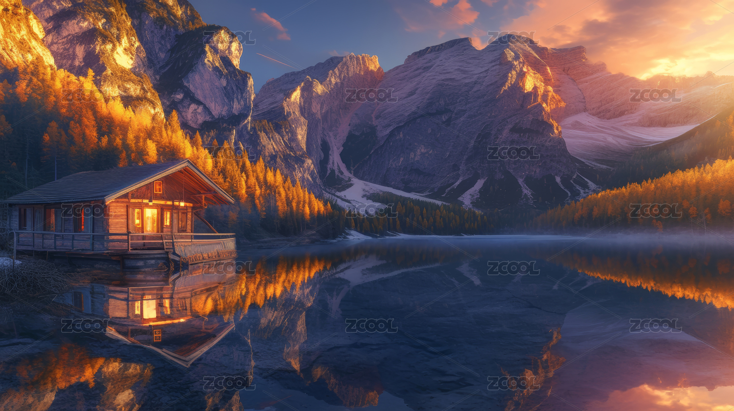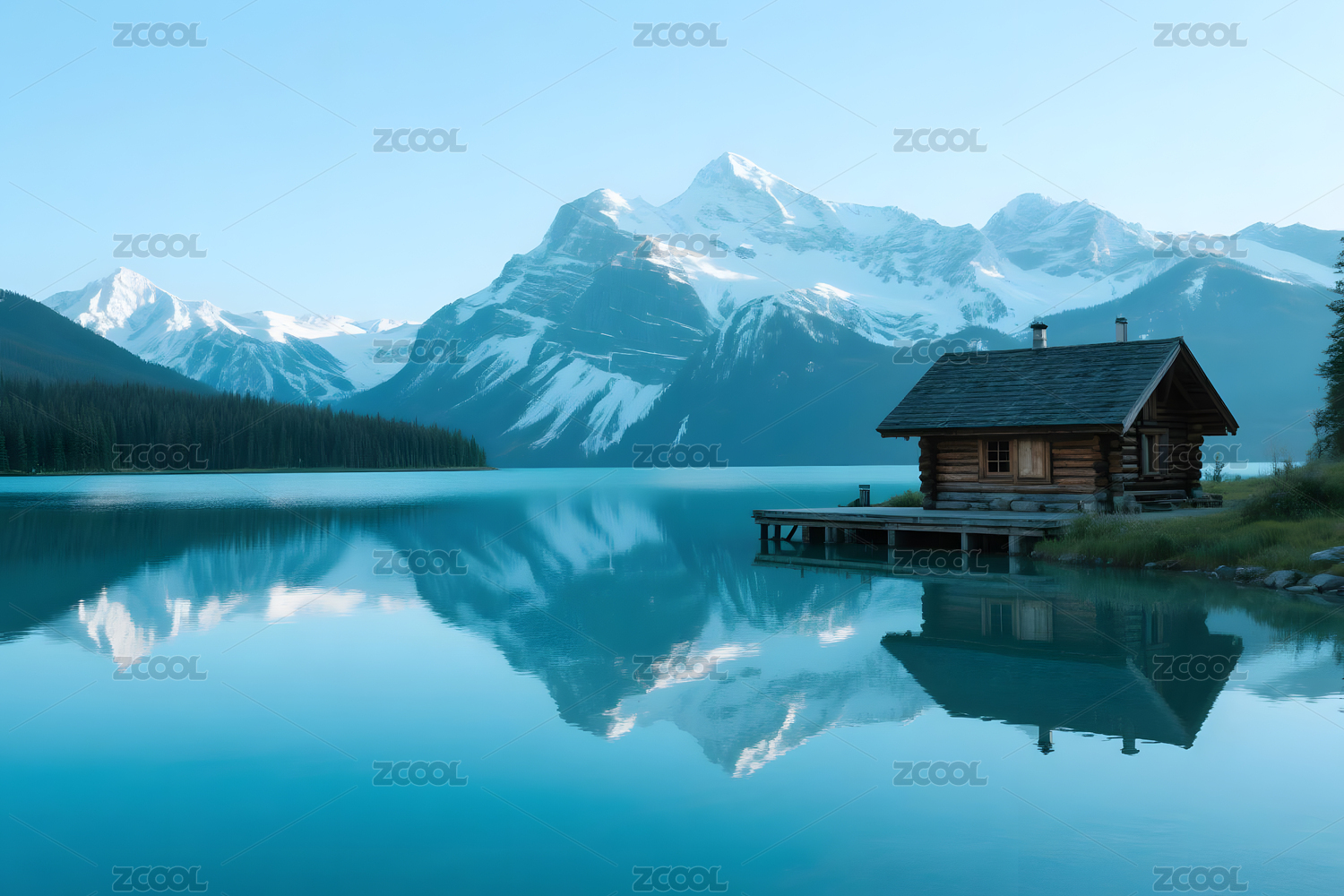 湖边,木屋,山水,景致,栈桥,延伸,清澈,碧绿,湖水,高耸