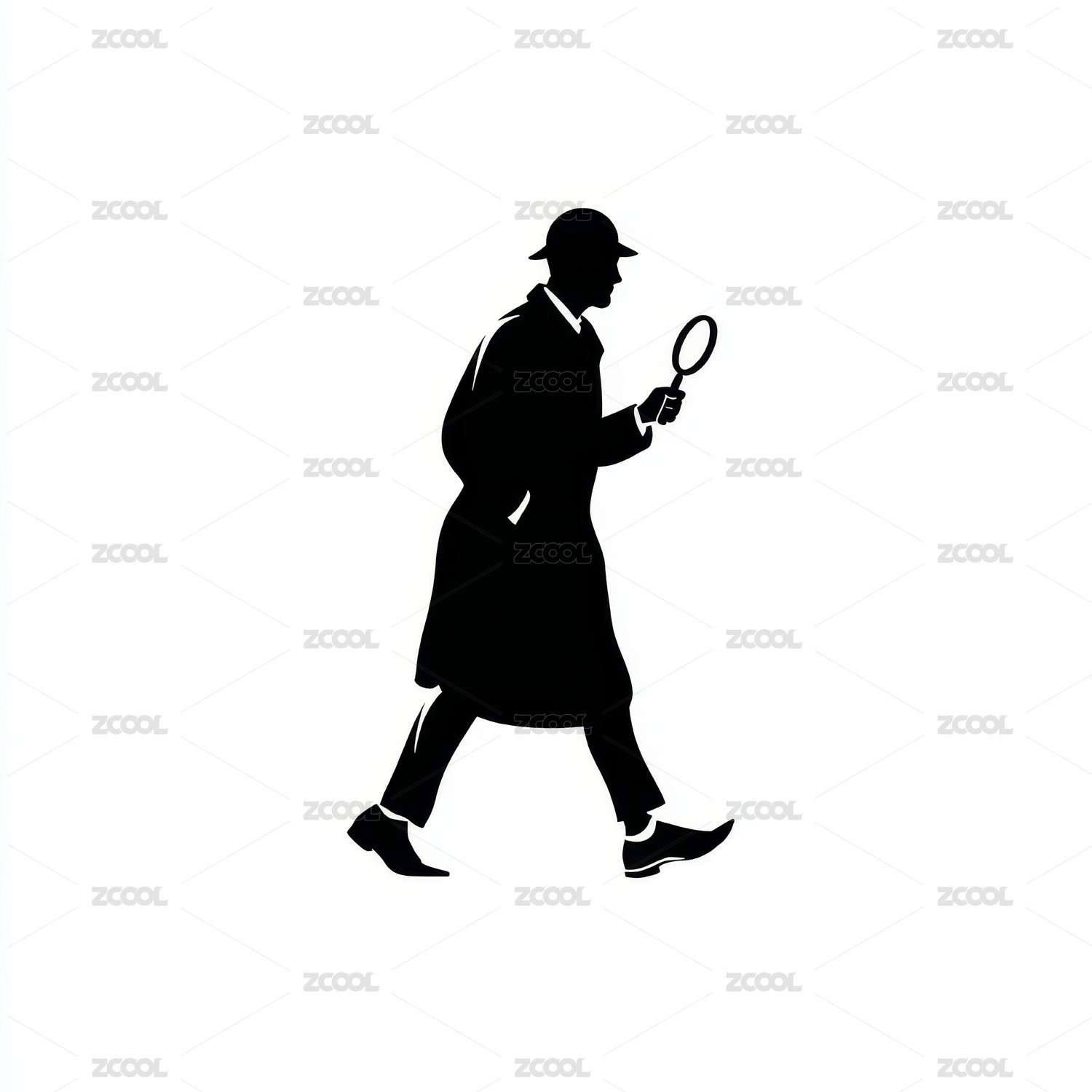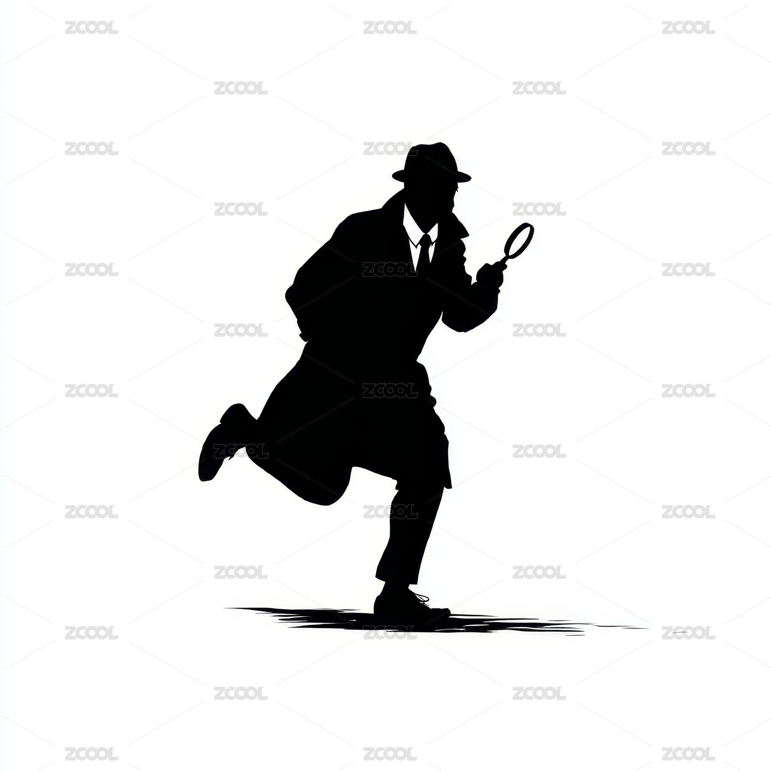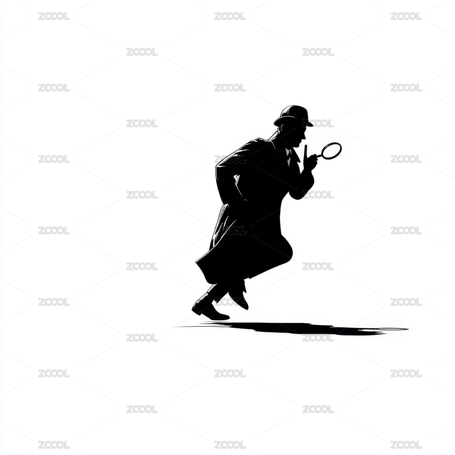 黑剪影,侦探,持镜,奔跑,帽子,风衣,放大镜,白色,背景,对比