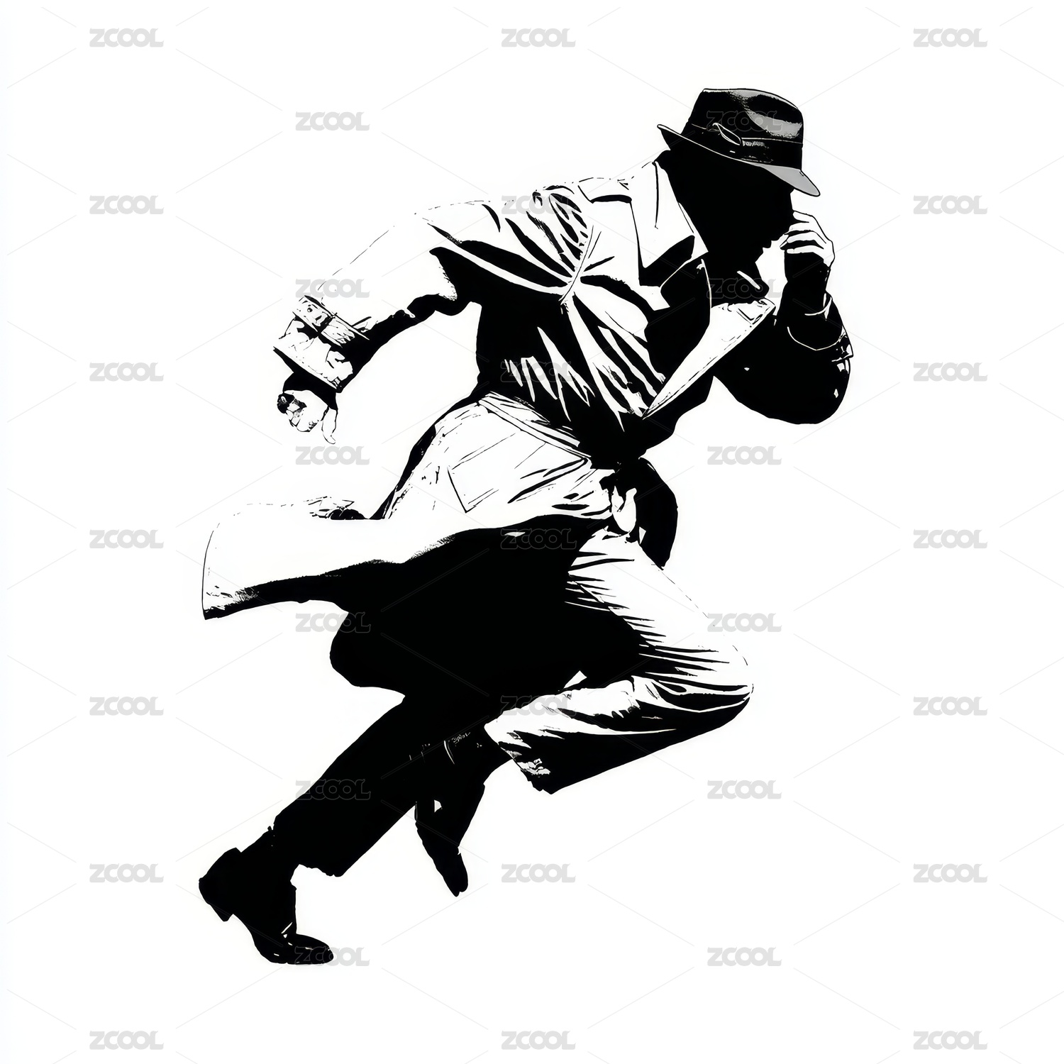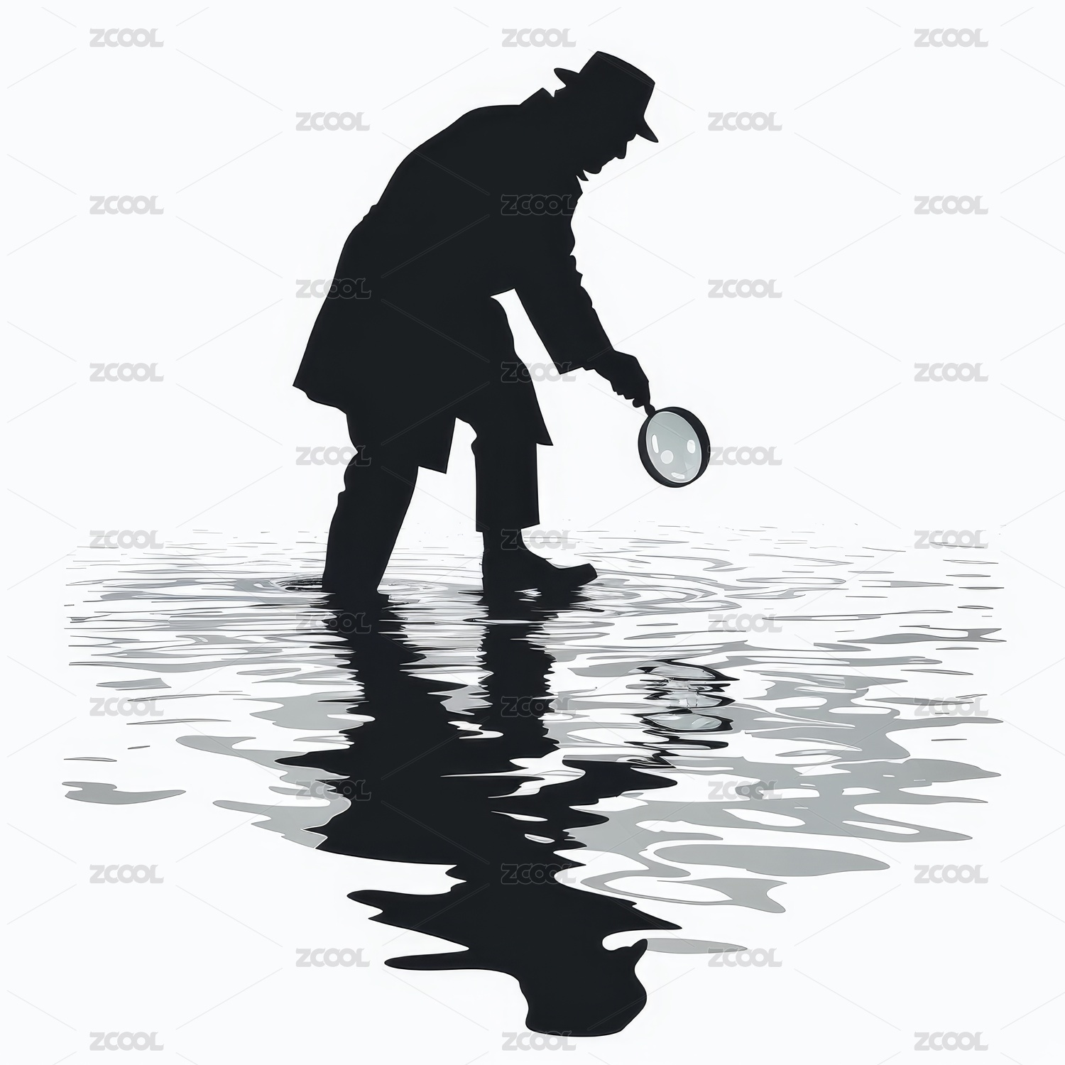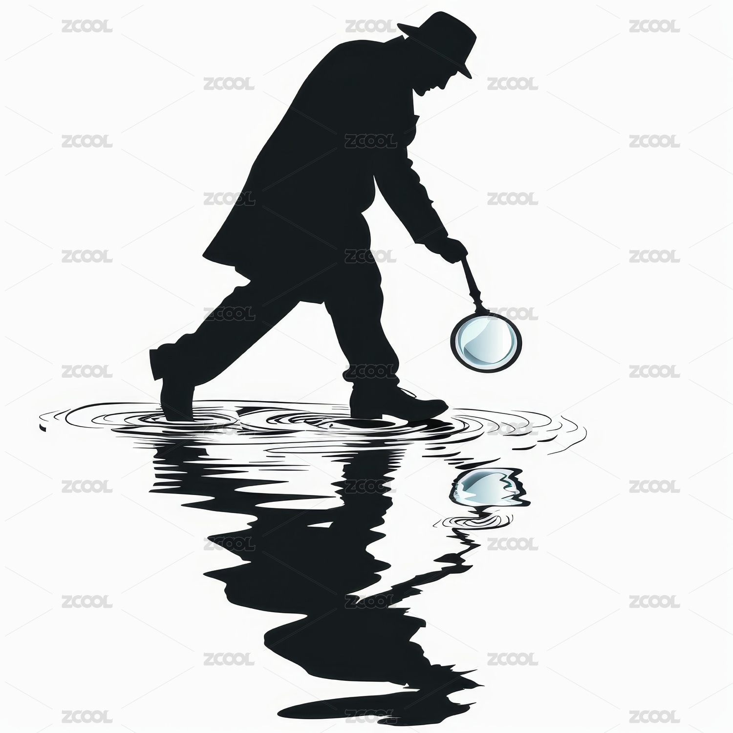 黑剪影,侦探,持镜,奔跑,帽子,风衣,放大镜,白色,背景,对比