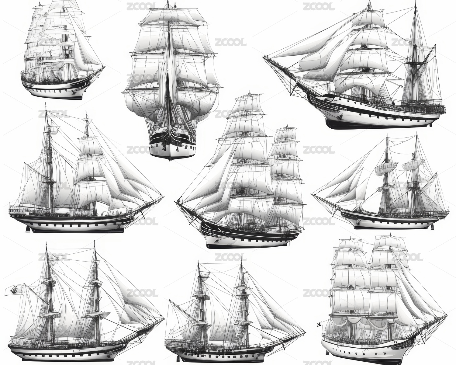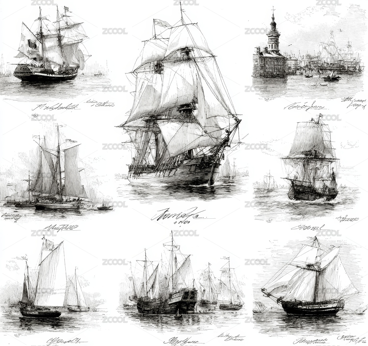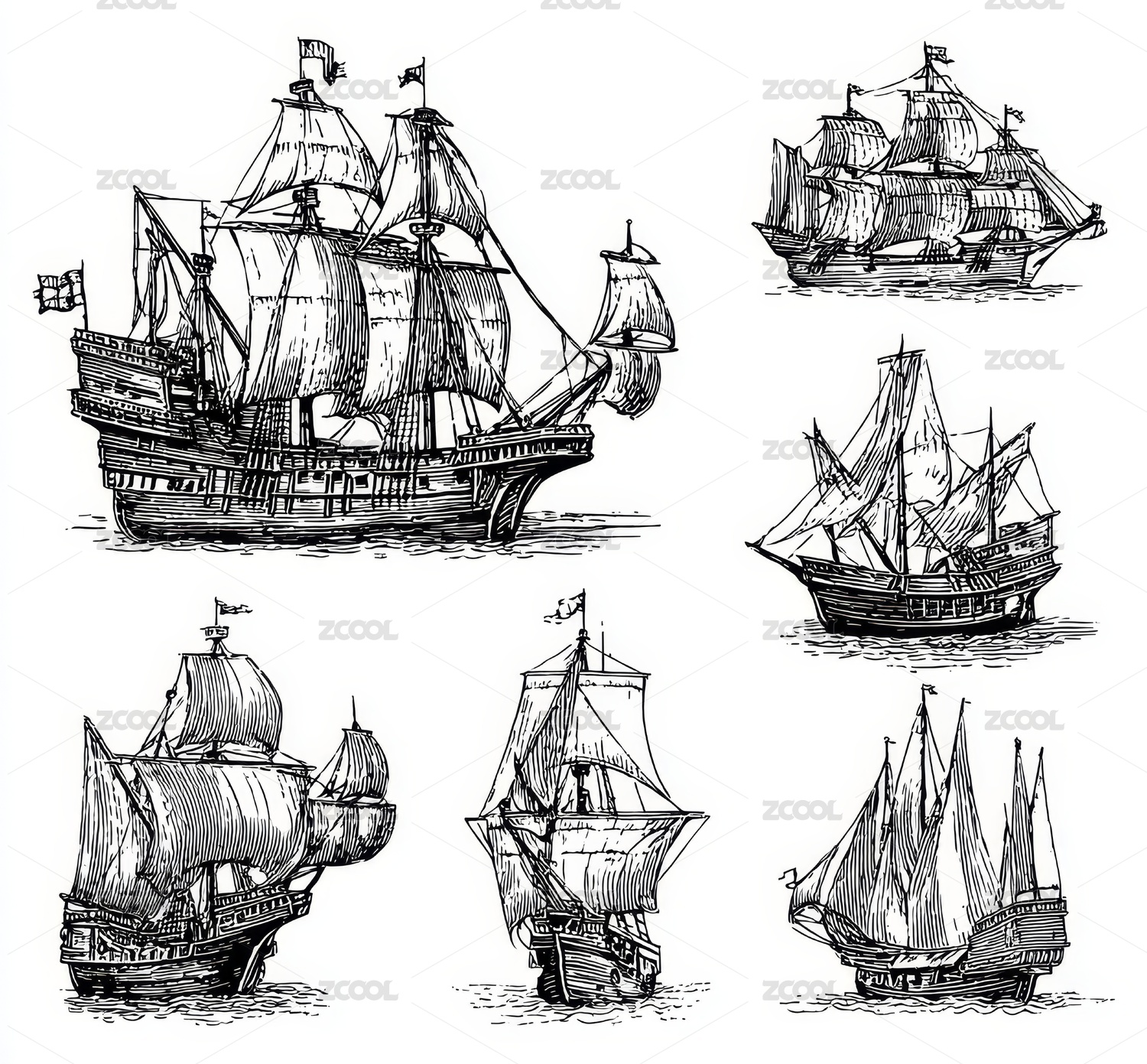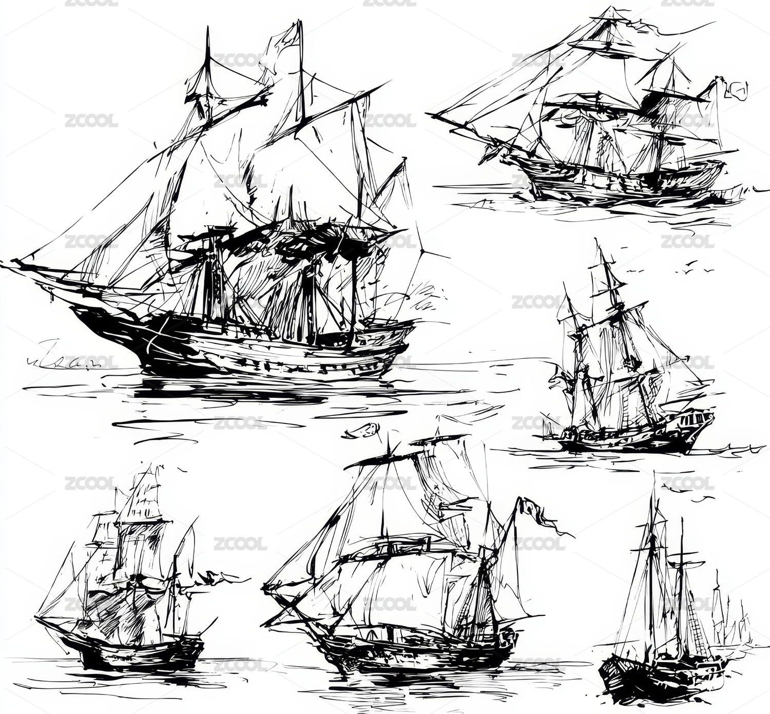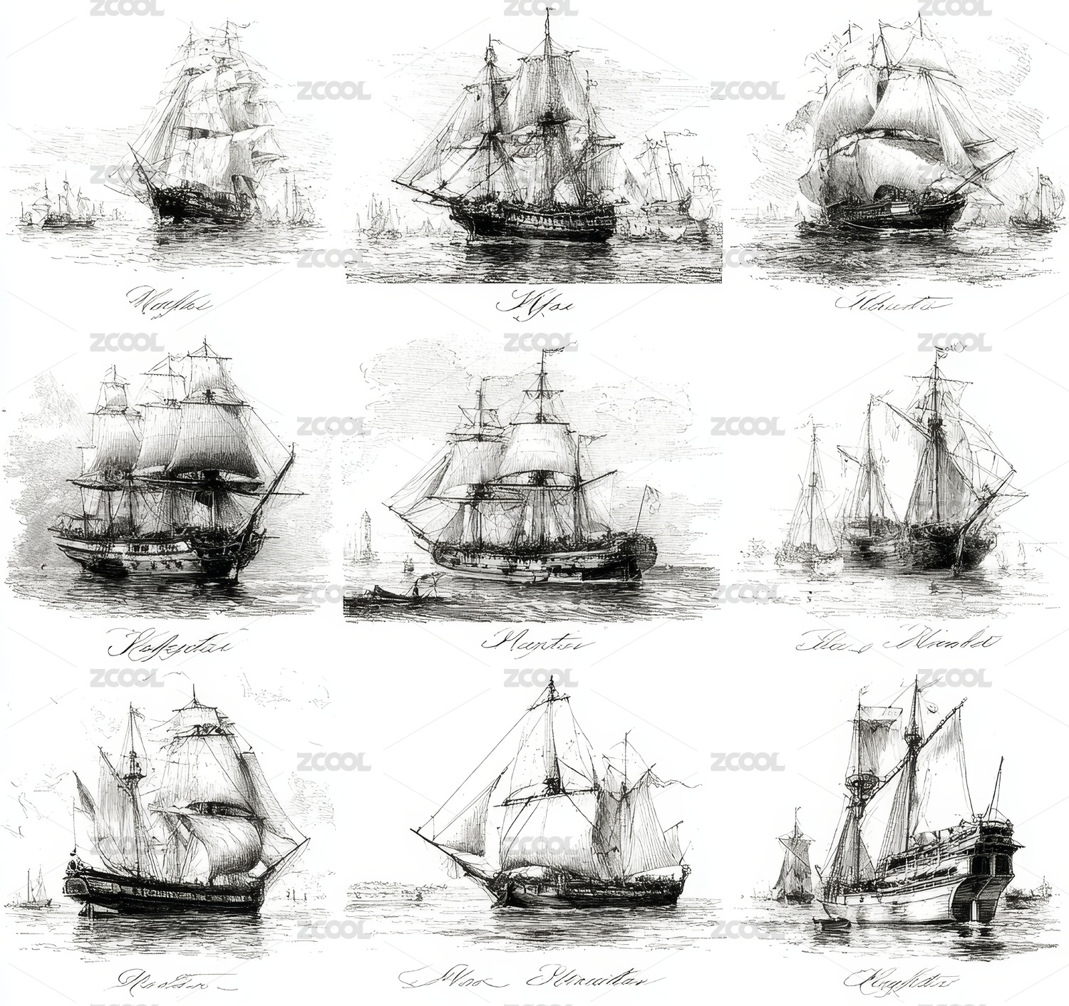 多艘,古典,帆船,黑白,插画,复古,风格,航海,历史,船舶