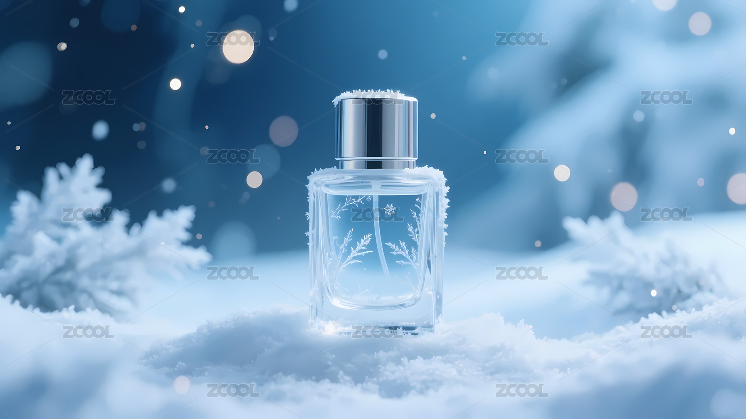 蓝色,背景,渐变,光斑,香水,瓶子,透明,雪景,清新,雪花