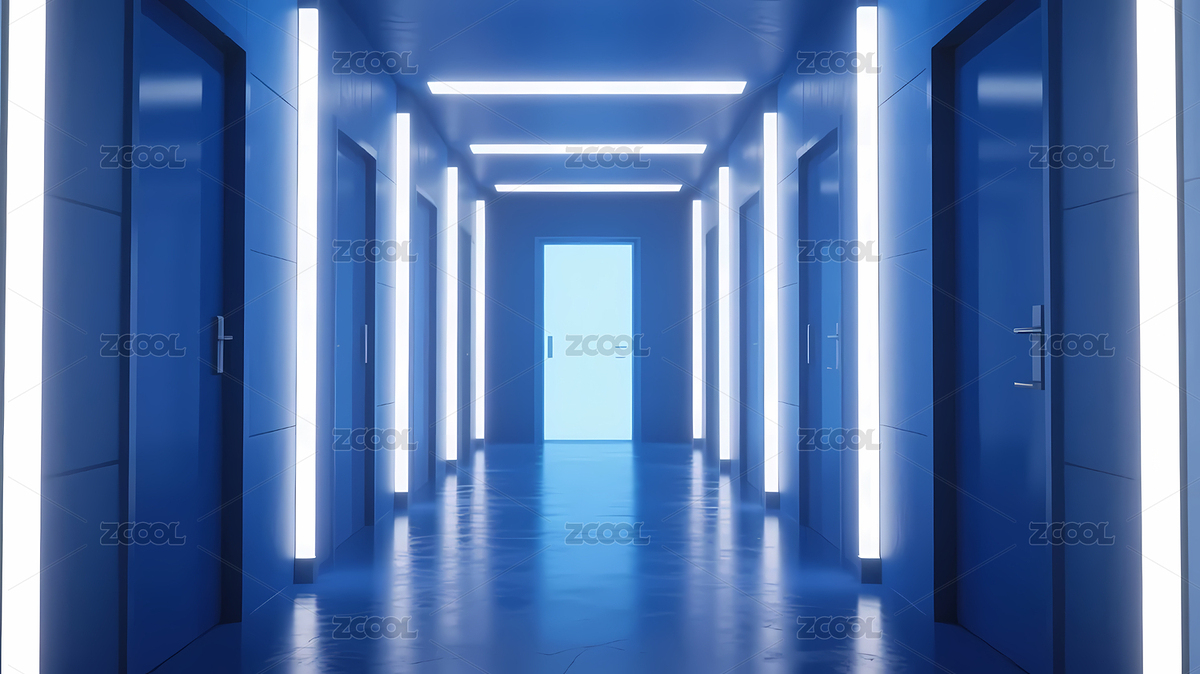 蓝灯光走廊白色门