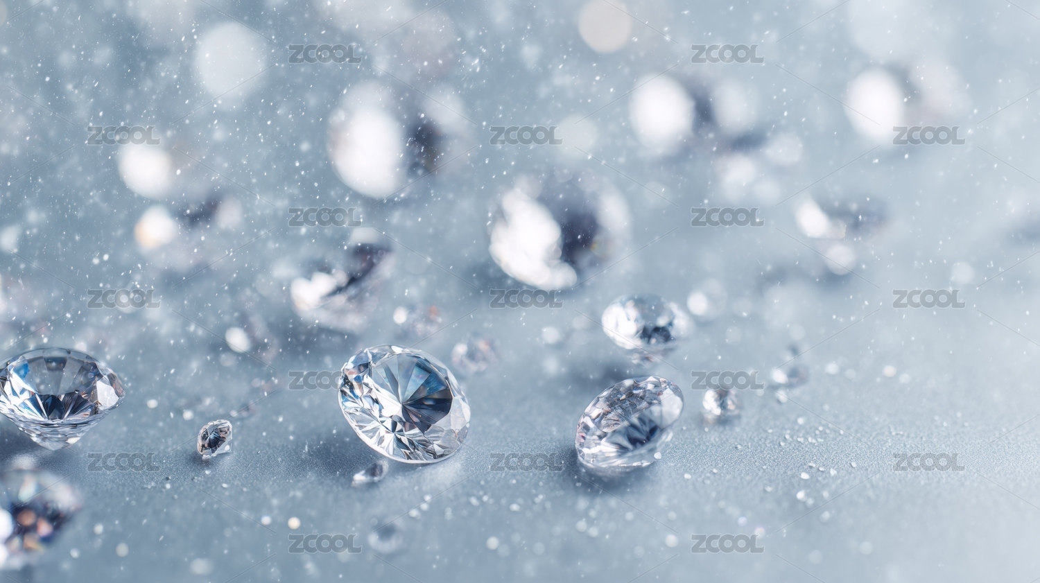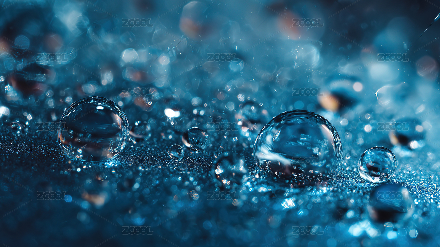 晶莹剔透的水滴与将要融化的冰块洒落在天蓝色的背景上